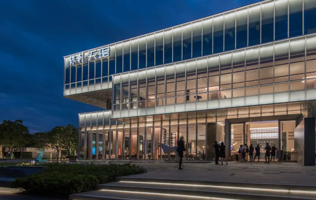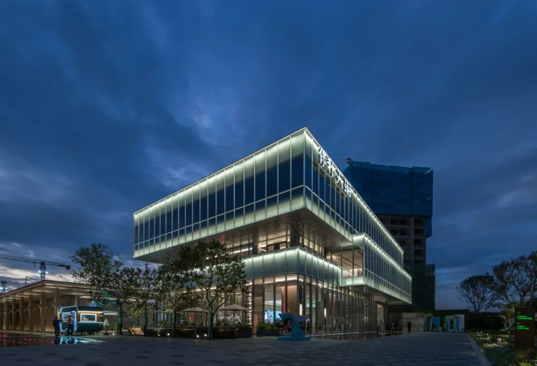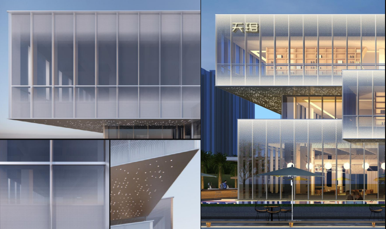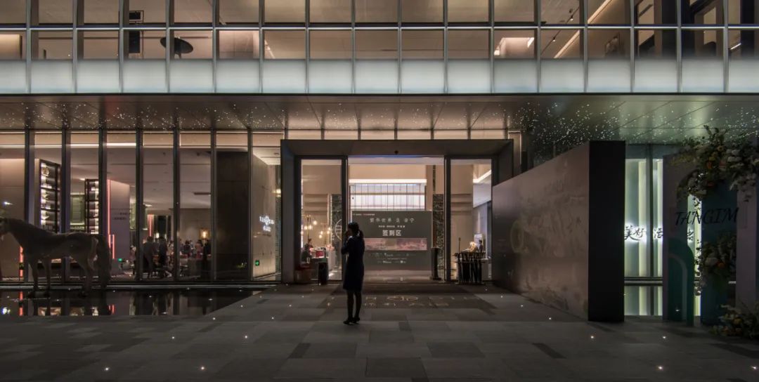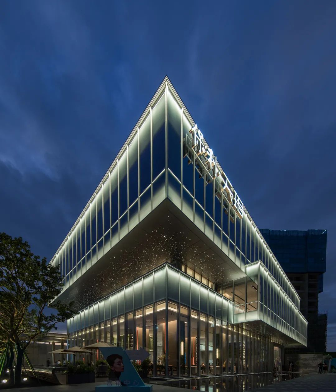 建筑的轮廓在光的照亮下,完好的表现了玻璃本身的釉点变化,柔和的光与釉点过渡相结合,在不见灯具的情况下,强调了建筑的体块轮廓,成为夜间建筑的表皮。