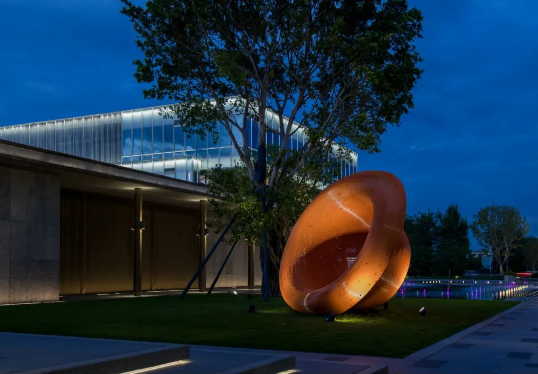 橙色的帽子景观小品,与远处的建筑通过照度稍弱的连廊,组成一幅层次丰富、空间清晰的画面效果。
