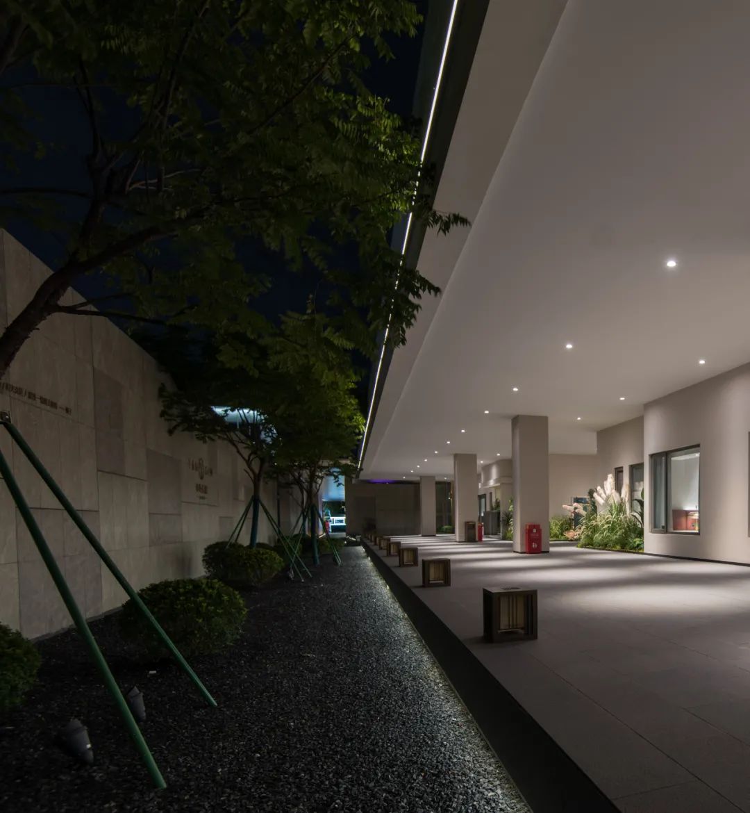 样板房通道处,筒灯有序列的照亮地面,形成引导性的效果,在有高差的边界线处暗藏灯带,既能达到提醒的作用,同时也可以通过溢出的光赋予到挡墙上,形成走道与挡墙之间的明暗过渡。
