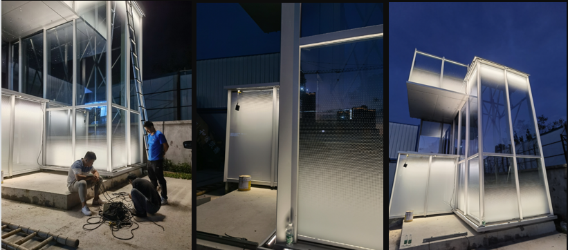 穿孔铝板的的光线,会随着步子的移动而闪烁,并非是采用了控制系统和点光源,而是通过内透光源与孔径的巧妙结合形成与视线的交汇。灵感来源于阳光在树叶中的渗透,随着步子的移动而发生变化。