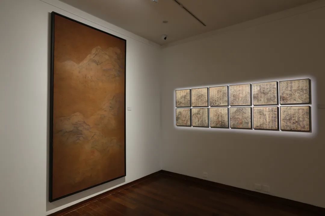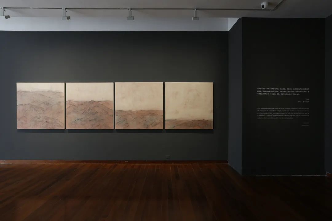 如今艺术家在《理——王绍强的维度与艺术》中的这一批新作也可以在这一脉络中被理解,它们成就于艺术家在甘肃敦煌、张掖,及山海关等一带的考察旅行。一望无垠的大漠孤烟、长河落日,天地相接的壮阔景观成为了这个系列的创作元素。比如四联画《夅》和立轴《千米》就展现了大西北特有的雅丹地貌。“雅丹”来自维吾尔语“yardang”,本意为具有陡壁的土丘。雅丹地貌往往指分布于极端干旱或部分干旱地区,是一种受到长期风蚀作用而成的奇特地貌。