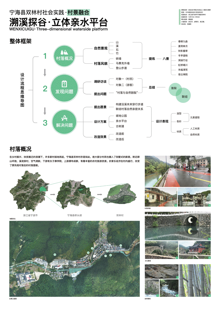 通过对杭州及周边地区多座博物馆与商业展陈的实地考察,以感知为设计之始,以调研为设计之基,以社会为设计之源,以实践为设计之本。本次展览选取两个维度呈现综合设计社会实践的基本样貌。一是会展策划主题的文化表现维度,演绎社会与时空延展变化的叙事之道。一是村落更新主题的社群空间维度,探索社会与自然和谐交融的澄明之境。