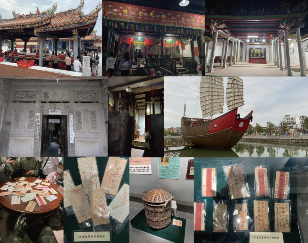 在作品的创作前期调研过程中,我们前往了侨批文化的发源地——汕头进行实地考察。广东省汕头市澄海区的樟林古港是当年潮汕先侨乘红头船“过番”出海的启航点,是海上丝绸之路的起源地之一,如今仍留下了许多“过番”的痕迹。如潮侨蓝今生回乡反哺建设的古建筑群——南盛里,现仍有后代生活在其中,延续着传统生活风俗习惯,如祭神。因此当地仍保留着大大小小的神明庙,我们很幸运地遇到了一位守护“三山国王”庙的爷爷,他声情并茂地给我们讲述了当年“过番”的人们是在哪个码头上下船,是如何搭台唱大戏向神明祭拜祈求出海平安的故事,在爷爷的故事的感染下,我更加坚定地希望能通过自己的设计将这段故事展现在观者面前。