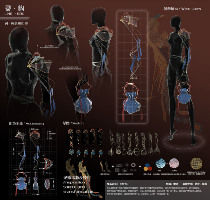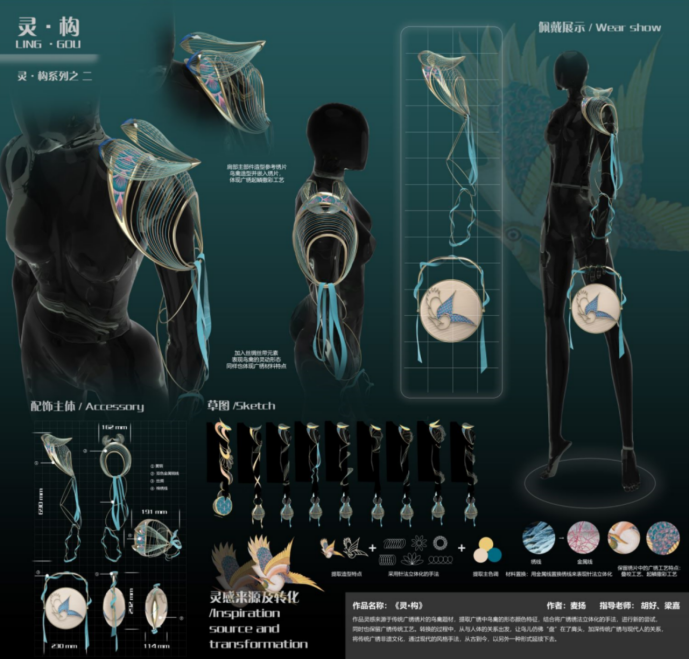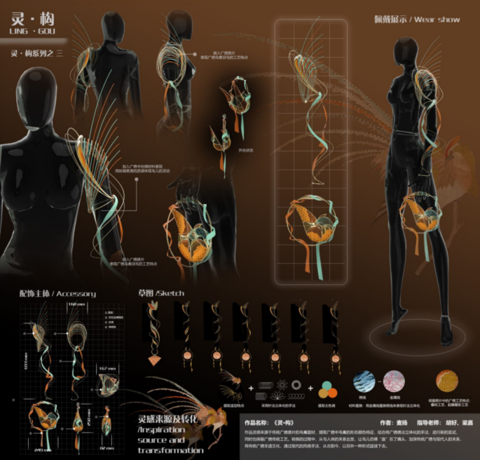 开始尝试用首饰来做文创,是在大三的一次博物馆广绣文创课题,当时在调研过程中发现目前博物馆文创大多数是日常用品类,它们很多时候只是摆在家里,这样的文创产品给我个人的感觉是有距离感,只能从表面看到文物相关的元素装饰,但是感觉不到这个物件带来的“温度”,因此我希望找一个可以跟人“亲密接触”的载体,去感受历史文物的“温度”,因此选择了首饰这个相对其他物件能跟人近距离“亲密接触”并外观可以吸引观众的载体。就此产出了我的第一套文创首饰——灵·构,聚焦广绣中代表性的鸟禽题材,把鸟禽的姿态立体化,保留广绣的传统刺绣工艺,人鸟互动的概念,以鸟盘踞在肩头的形式,完成了一系列概念的文创首饰。也以这个课题为引子,进一步深入文创首饰的研究,完成我的毕设“过番-从潮州金漆木雕到侨批文化的装置与首饰创新设计”。