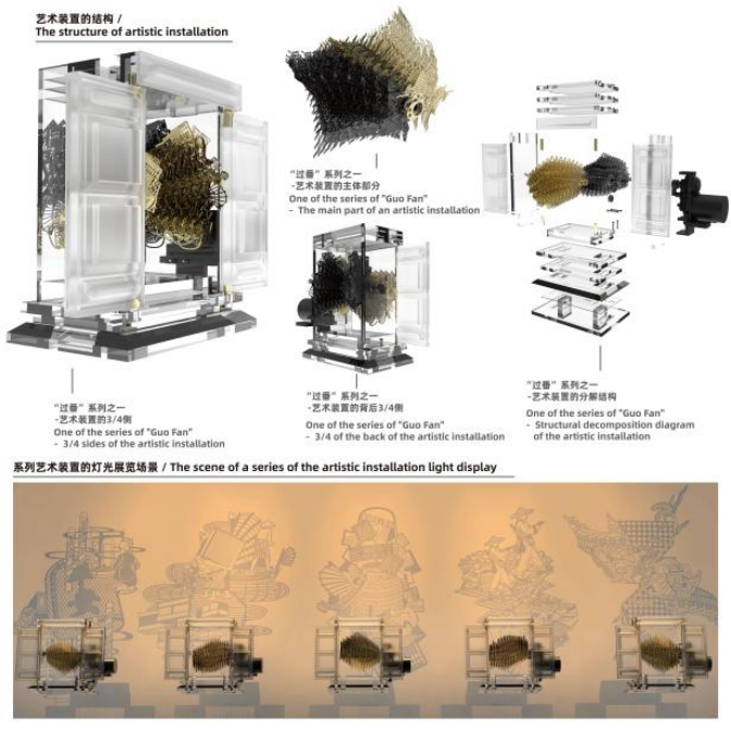 《过番》作品从画图到制作完成经历了很多挫折,用到的制作工艺有:金属激光切割、CNC雕刻、3D打印。材料有:铝板、亚克力、不锈钢。主体的金属片从材料的选择上做了大量的试验,从纸板到各个厚度的木板及金属板材,都一一进行了试验,最终为了保证装置运动的流畅,选择了较轻的铝材,用金属激光切割的工艺实现复杂图案的雕刻。神龛部分,为了让观众能清楚看见主体物,采用了更具现代感的透明亚克力材质,用CNC雕刻的方式实现。首饰底托的部分,由于要保证结构的稳固和使用的持久性,选择了硬度较高且不易氧化的不锈钢材质,用金属粉末3D打印的方式实现。