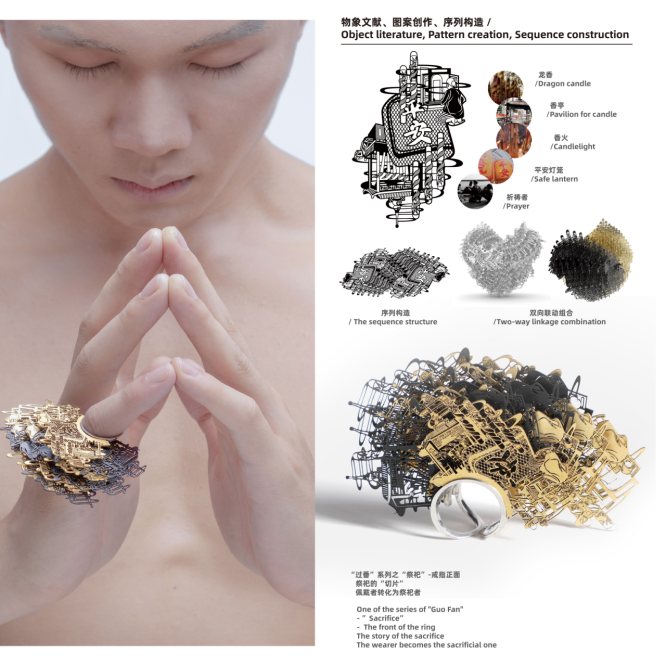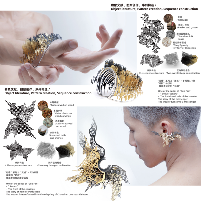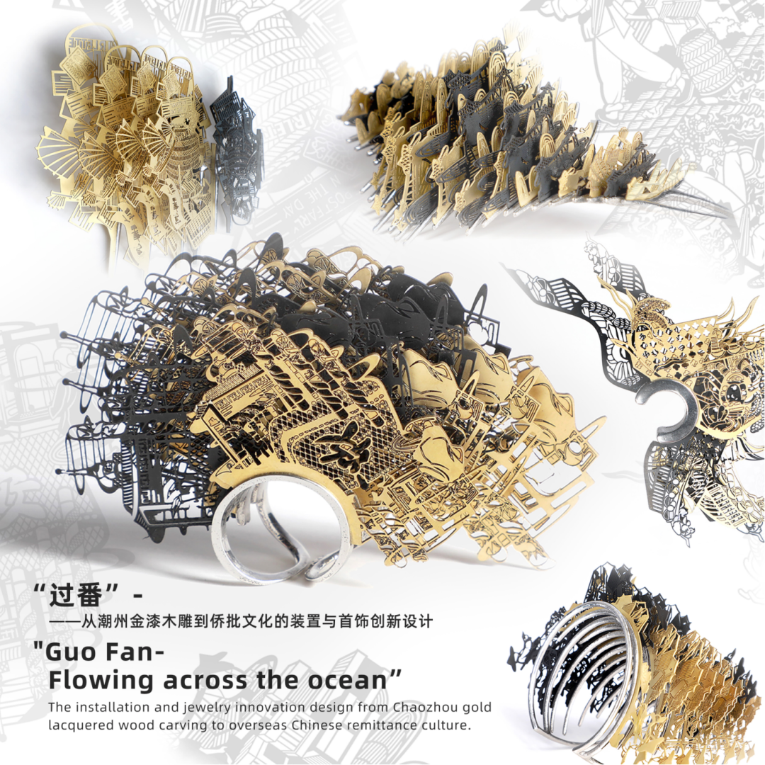 可以谈谈你的设计作品《过番-从潮州金漆木雕到侨批文化的装置与首饰创新设计》的设计理念和设计过程吗?