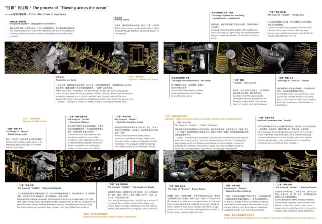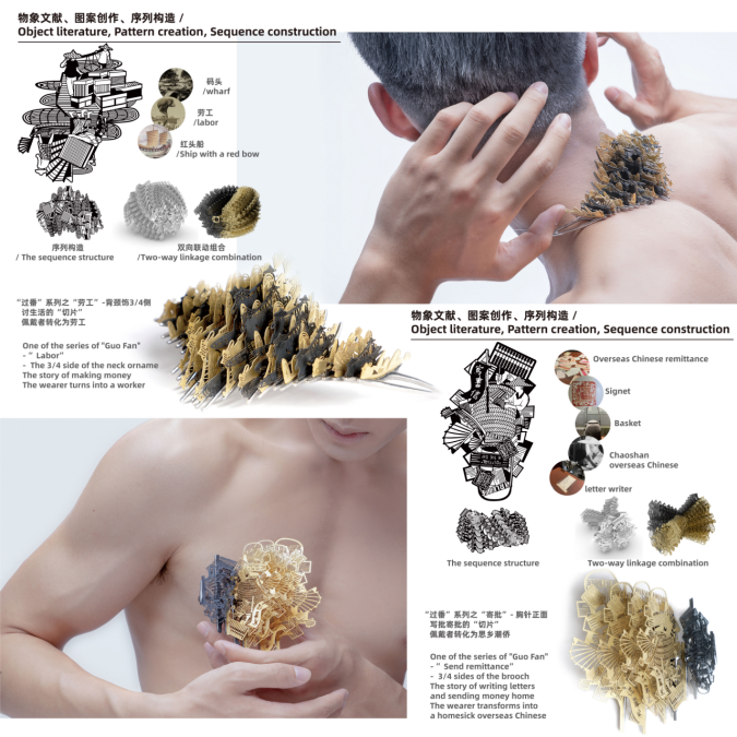 这个作品是以“侨批文化”为主体,研究潮汕海洋文化中重要的潮侨文化,挖掘潮汕先侨下南洋谋生的历史文本,以叙事设计的方式,艺术装置衍生艺术首饰,来讲述潮汕先侨从“过番”到“回乡反哺”的历史故事。借助当代技艺缅怀、追思、致敬远涉重洋的潮汕先侨和艰苦奋斗的精神,最终达到传承和弘扬潮汕传统文化和精神的目的。