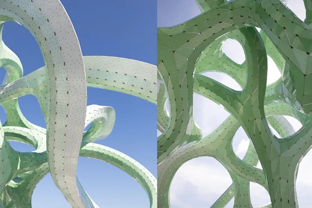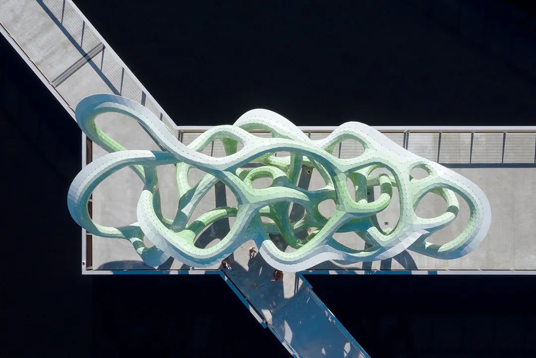 蜿蜒的铝制结构巧妙地模仿了本土红树林的形态,将城市滨河公园的休闲空间延伸到水道上。它的建筑构造有利于人们在固定在桥板上的七根树干之中嬉戏漫步,它的树枝也是模仿了红树林缠绕成结的根部形状。