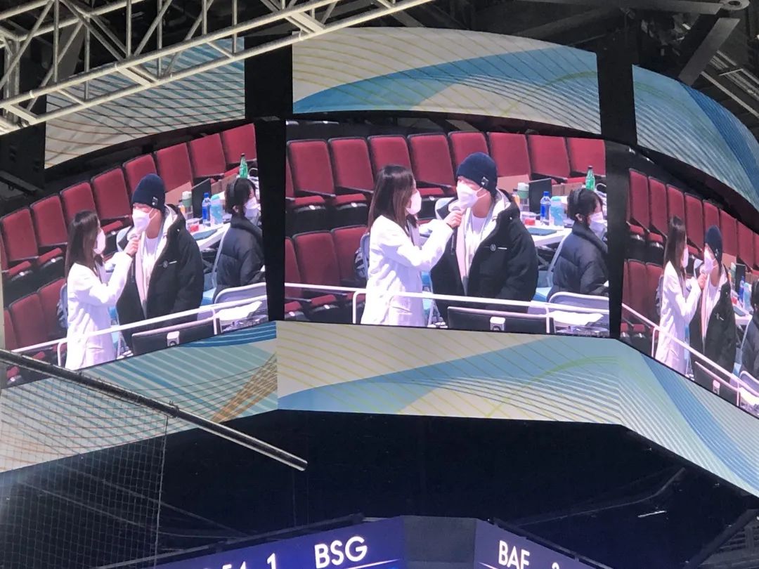 在五棵松体育中心举行的冰球比赛中,恰逢第22个中国记者节。体育展示团队在正常保障赛事之外,为在场的新闻工作者送上鲜花祝福,编排欢快的舞蹈与媒体席上的记者们共同庆祝。现场的媒体工作人员、运动员和嘉宾也被体育展示团队细致全面的工作感动,多次献上掌声。
