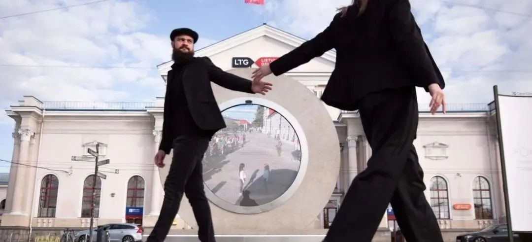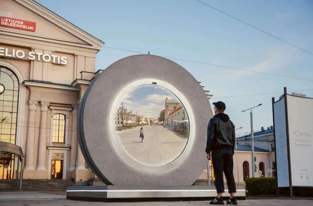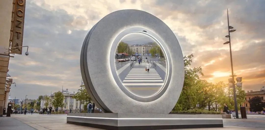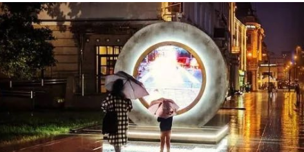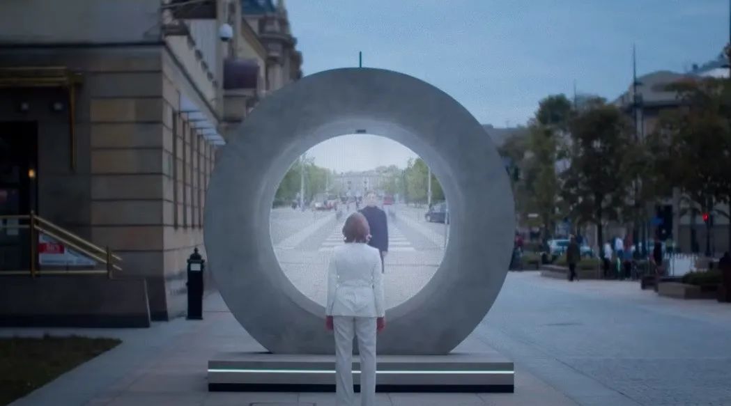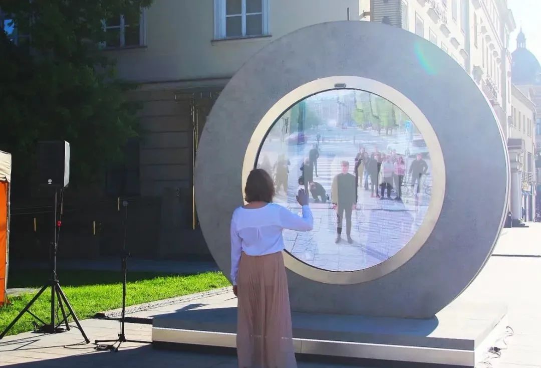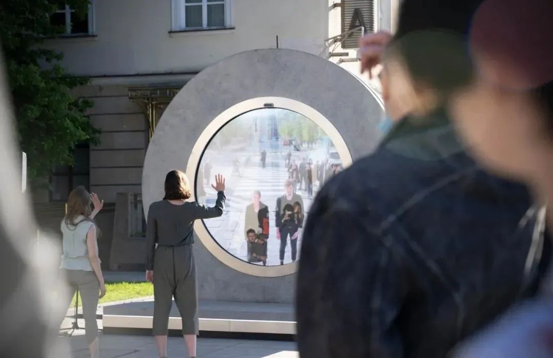 这是类似一个虚拟的圆形“时空门”,安装了大屏幕和高清摄像头,可以通过高速网络在两个城市之间实时传输图像。