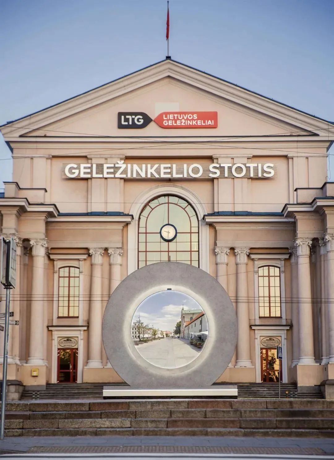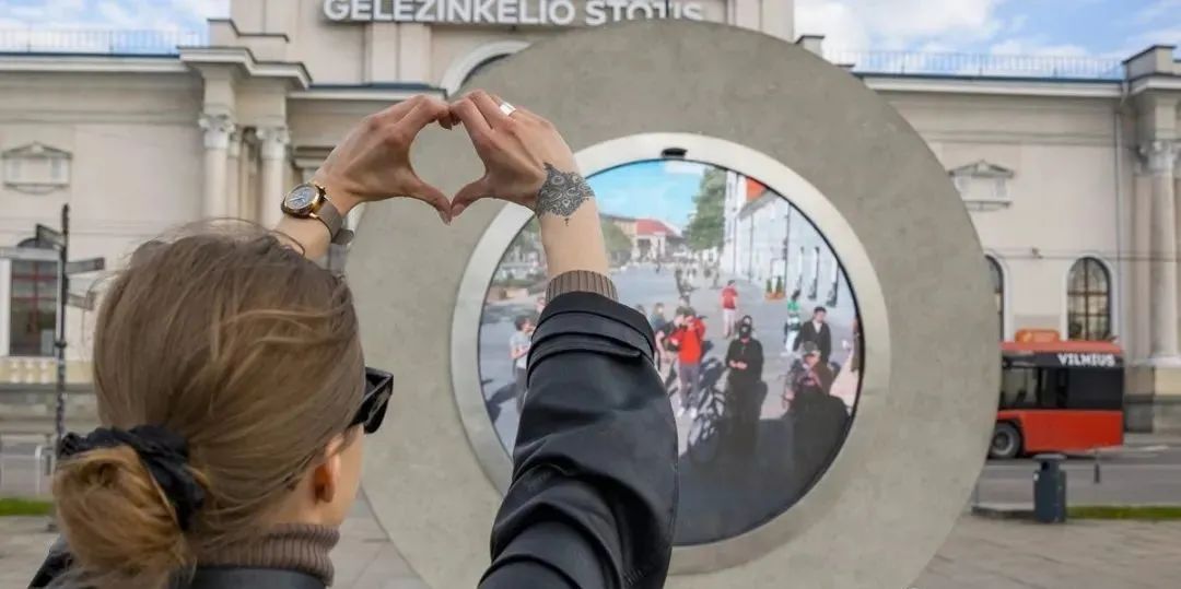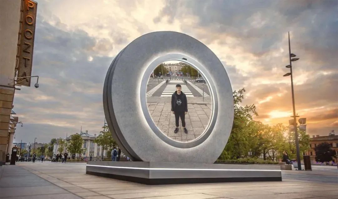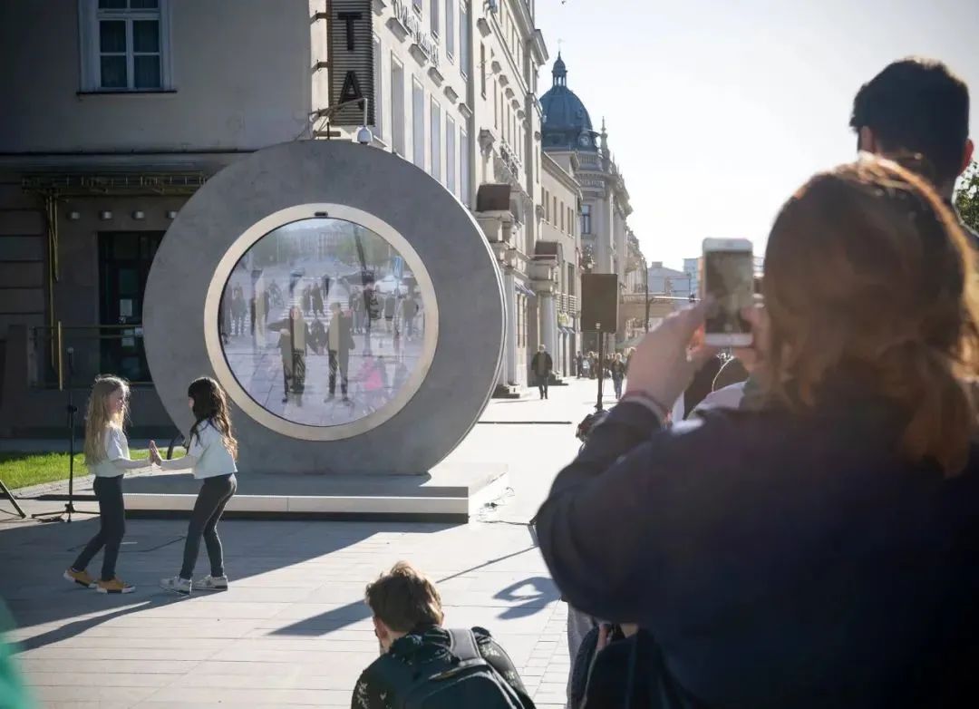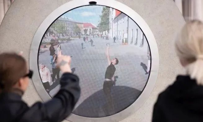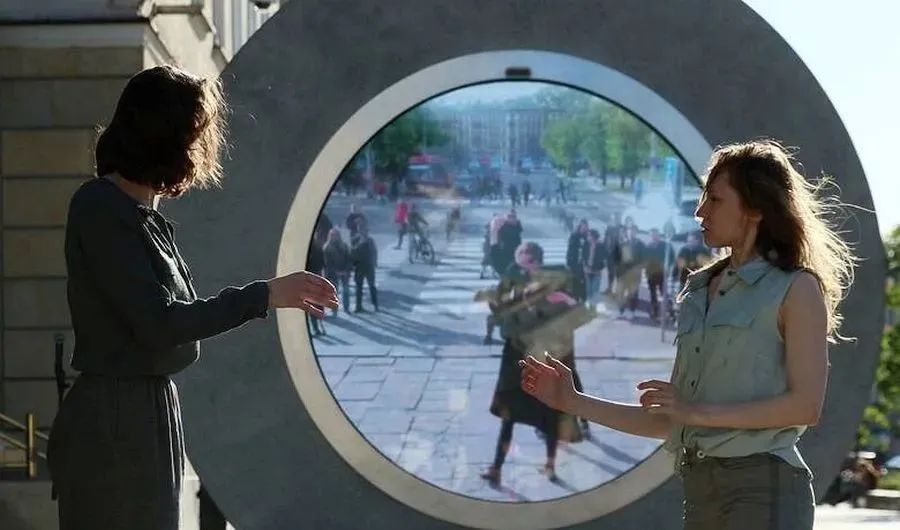 这是类似一个虚拟的圆形“时空门”,安装了大屏幕和高清摄像头,可以通过高速网络在两个城市之间实时传输图像。