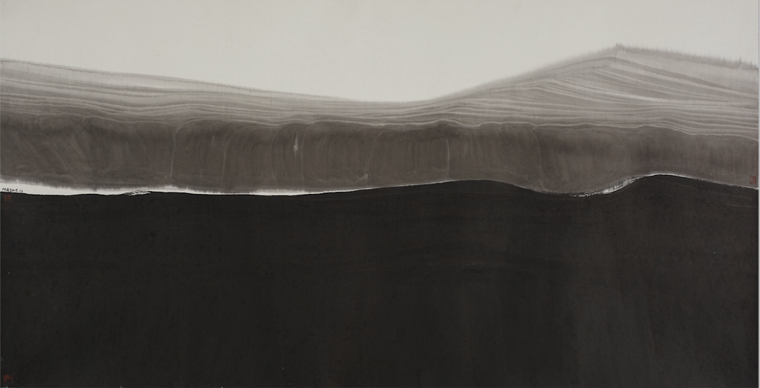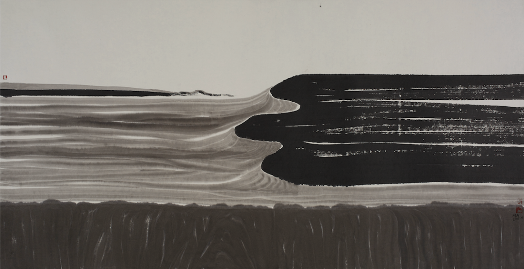 第一阶段的作品,马泉以观者的横向视角,表现了沙丘的流动、起伏、明暗......抽象的黑白灰和笔墨肌理,隐喻了沙漠的视觉特征。不少人看后评价,这是一种新的水墨语言。然而,马泉对此并不满意。宣纸、笔墨、毛毡,当用起这些看似熟悉的工具时,马泉却感到了陌生。这种陌生不是技术水平和工具掌握的不娴熟,而是内心感受与形式表达的落差。他说:“初期,我根本没有办法把我想要的叙事内容通过水墨这种媒介表达出来,脑中想的和手中画的相差太远。我始终割舍不了图形,图像的意象明显,并且一旦落实到纸面后就扁平化了。”马泉直言:“我能判断出当时这种表现方式行不通,但怎样做才行得通,自己也没有想清楚。显然,我要表达的是无形的沙漠,而不是目力所及的沙漠。这个不断探索却又充满未知的过程,必须痛苦地迈过去。”虽然在讲述时一带而过,但其间的胶着、起伏是一段难以言表的经历。马泉完成了数千幅“水墨沙漠”。有时,他不舍昼夜地在工作室创作;有时,他主动停下来反复问自己这是否是他想要的。直到两年后,他画出了带动其整个意识和表达媒介转向的重要作品。