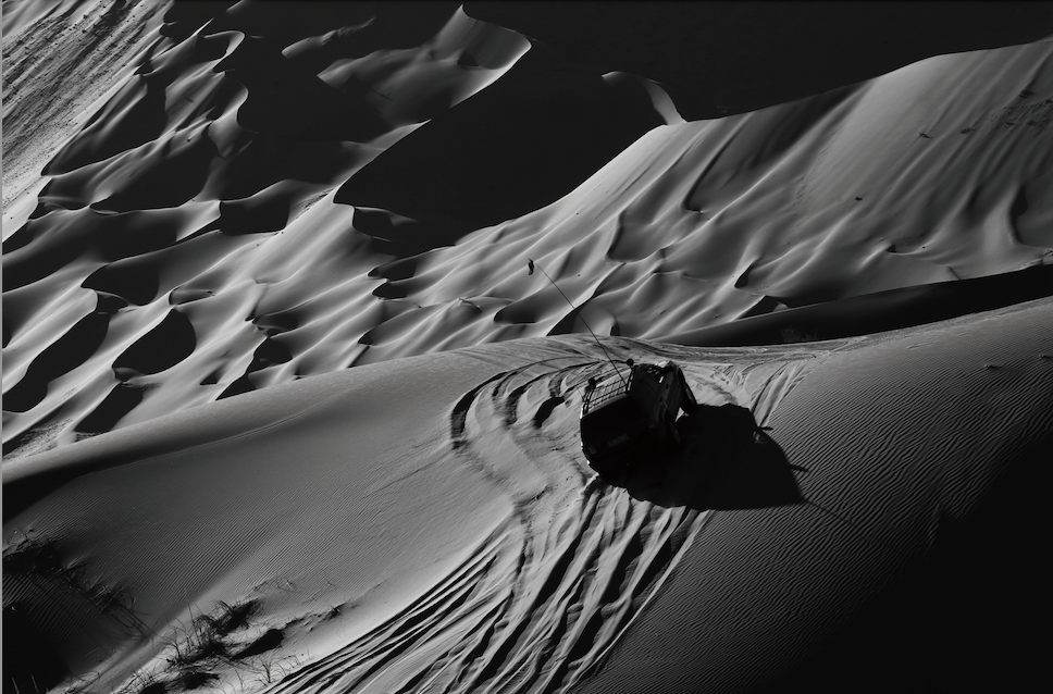 沙漠是中国艺术创作中并不常见的题材。之所以选择它,源于马泉的个人经历。2006年,马泉第一次随朋友去沙漠探险。沙漠广袤无垠,看似贫瘠却蕴含着无穷的生命力;驱车行进时,轮胎与沙地摩擦产生的独特触感,身处隐藏的险境却能掌控化解的极限挑战;城市与沙漠、人工与自然两种环境之间的巨大差异......这些既让他感到震撼兴奋,也对沙漠有了一种复杂的情感:“仿佛回到人类出发的地方,进入一个似曾相识却非常陌生但又无比亲近的空间。”这种敏锐的感受,激发出探究的愿望。从那时起到2012年,马泉坚持每年两至三次驾车进入沙漠,希望通过近距离的观察,用身体的感受,伴随着大量的阅读,明白“沙漠是什么”。