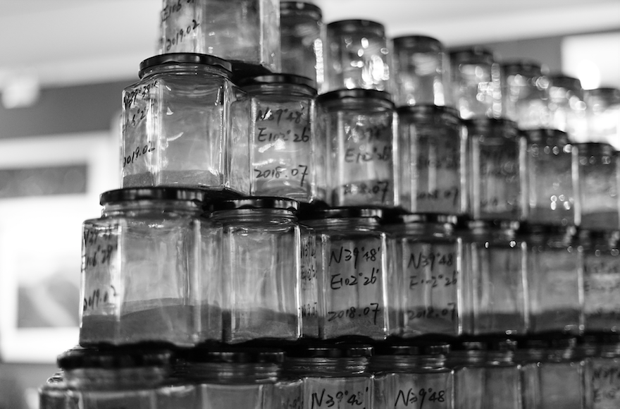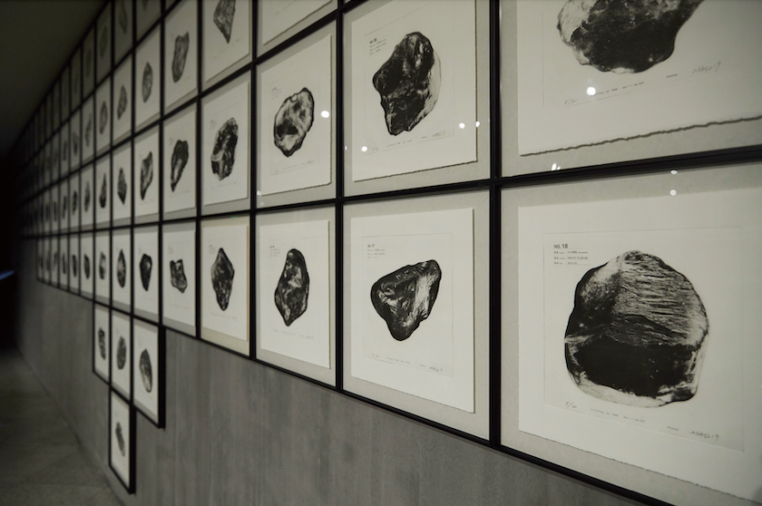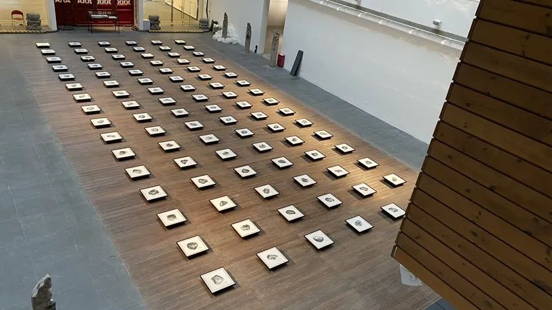 马泉在策展时特别与关山月美术馆方面沟通,注意人流控制,保证每片区域不要有太多观众,避免影响参观体验。在展览现场,沙样、版画和陶块组成三套装置作品。每一撮沙样都经过筛滤,放在小瓶里,严整叠摞成金字塔形;100幅沙尘颗粒的版画布满墙面,每张左上角以图例的格式注名采样地点与时间,展墙一旁还摆放着打印好的图集,像翻看手册;陶块则像实验室里的样本,被整齐收纳在2米2米的木盒里。每组作品占据的空间都较大,水墨、影像等也是如此,各自搭建出一个氛围。