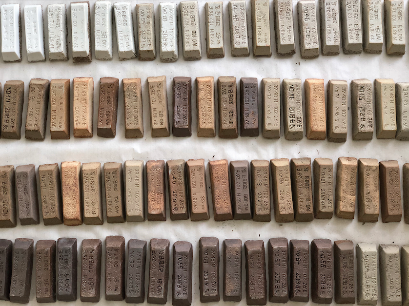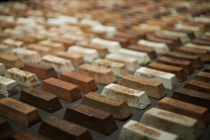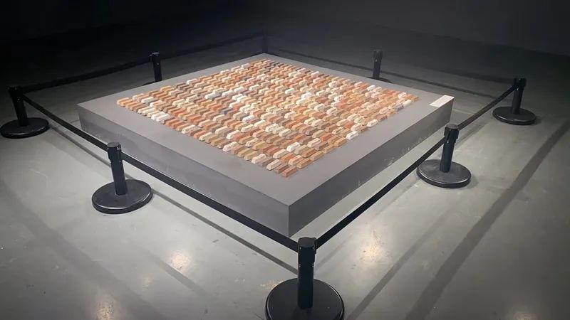 在呈现了沙尘颗粒的“类微观结构”之后,如何表达它们丰富的物质组成?马泉想到了另一种土的艺术——陶瓷。他用陶土、瓷泥混合着沙子在1300摄氏度的高温下焙烧。但是,不要任何器形,没有任何装饰,不引发任何与陶瓷这种独立艺术/工艺门类有关的联想,制成数百个尺寸一致的长方形陶块。同时,每个陶块又各不相同,表面刻记着沙样提取的地点与时间,颜色、光泽、质感或细微或明显的差异,提示着其中蕴含的海量信息与多样性。