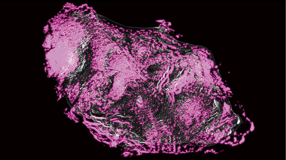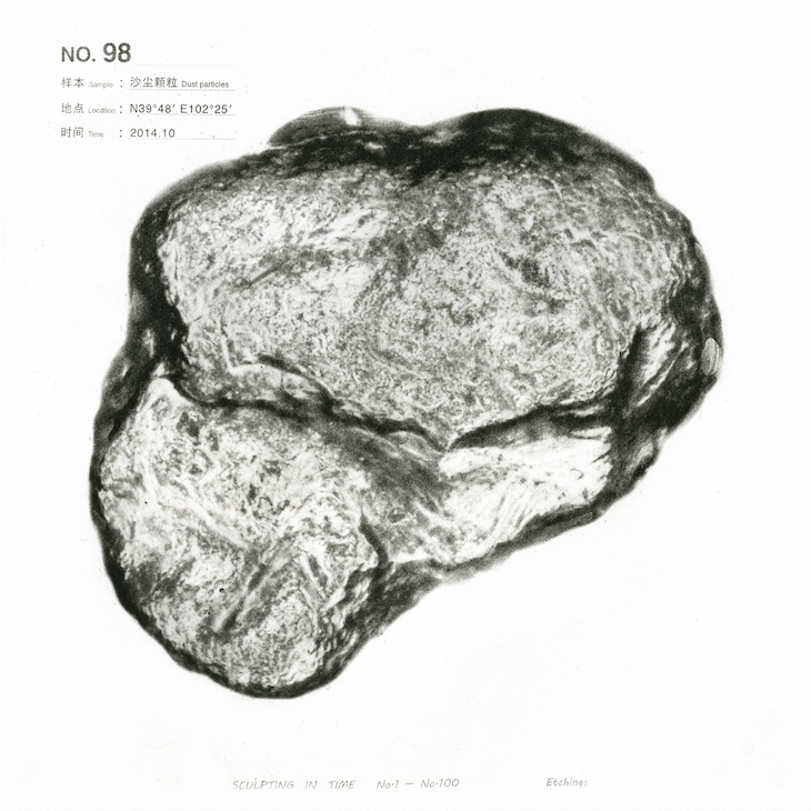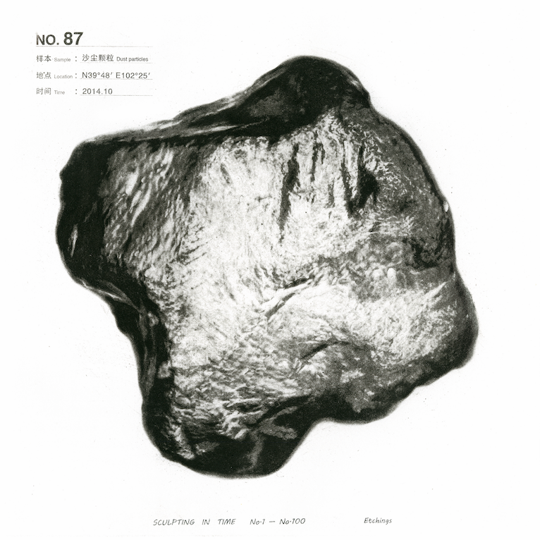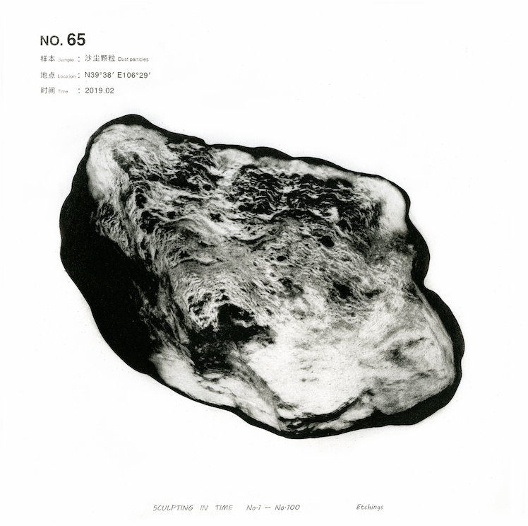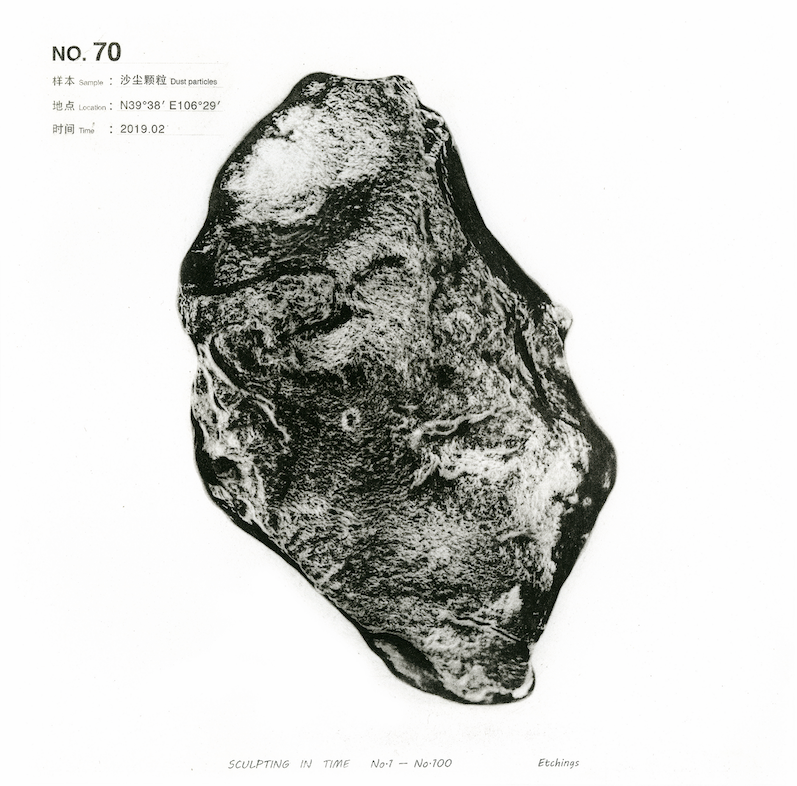 到了第三阶段,马泉说,早期的考察似乎是在有意与无意之间,而这次转念之后,他开始有计划地去不同地点采集“沙样”。“沙样”一词也反映出态度与路径的变化。他不再采取艺术化的方式,而是展开科学性的行动。每一撮沙样都准确记录下提取的地理位置、经度、维度和日期。回到工作室后,他购买了显微镜,试图观察沙粒表面的纹路,但效果始终不理想。茫无头绪之际,马泉经人介绍认识了清华大学材料学院的老师,在实验室团队的帮助下,用极高分辨率的显微镜结合成像技术,如CT扫描一样,获得了沙尘的图像,一枚颗粒有50张切片分层图像。然后,他再通过图像合成,将这些切片拼组“再造”成沙尘颗粒,一共100枚,并用铜版画印制,每枚印制20套。2000张《沙尘颗粒》的整个制作过程历时半年。翻开“叠加态”展览的画册,扉页即印着一幅放大的沙尘颗粒线图。如果不提示,很难想到它原来是微小到肉眼难辨的沙尘。上面的纹路丰富,好像俯瞰一片丘壑川流密布的地形,真可谓“一沙一世界”。