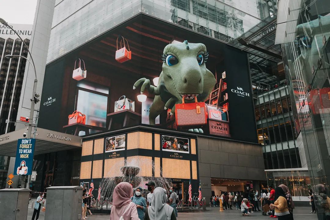 画面中COACH Rexy 恐龙实在是可爱到不行,它在吉隆坡 Pavilion 广场户外巨型屏幕橱窗跳出来!信步渡进放满 Coach 经典美包的房间内踱步,口中叼着 Rogue 经典美包,淘气地冲着大家眨眼,兴奋得左看右看,一幅心满意足后,朝楼下走下去。萌趣模样让人直呼太可爱了!