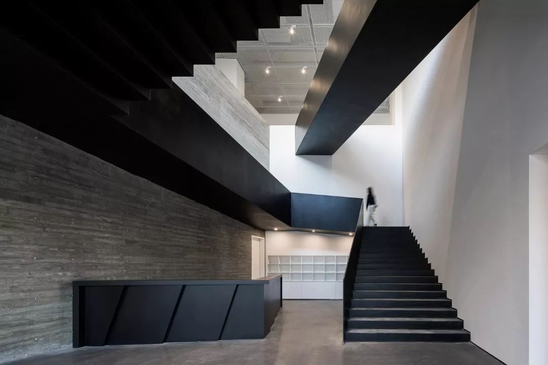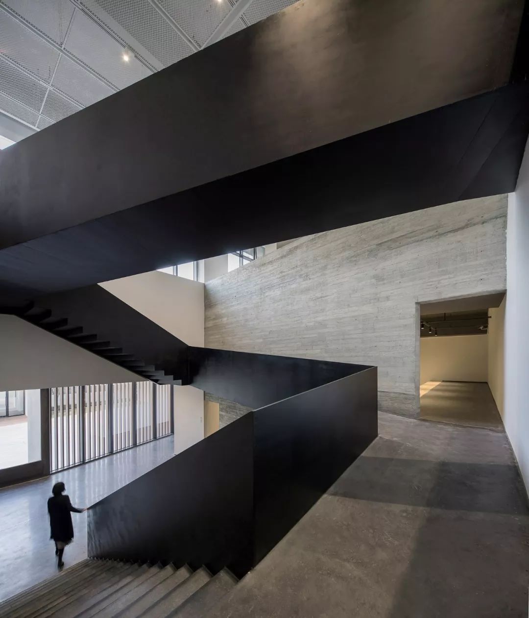 四方美术馆由平行的透视空间的“块”与黑色的竹纹灌浇混凝土的花园围墙组成,建筑整体轻盈地悬浮在空中。地面上的笔直的通道逐渐变成了上层曲折的通道。