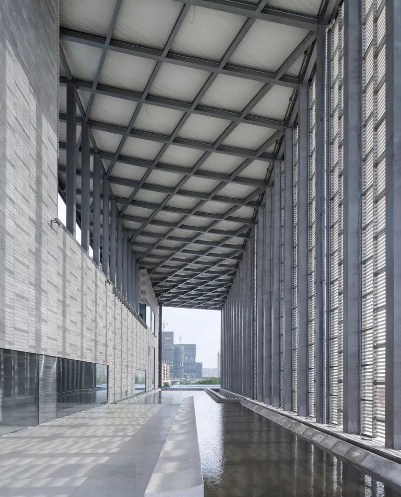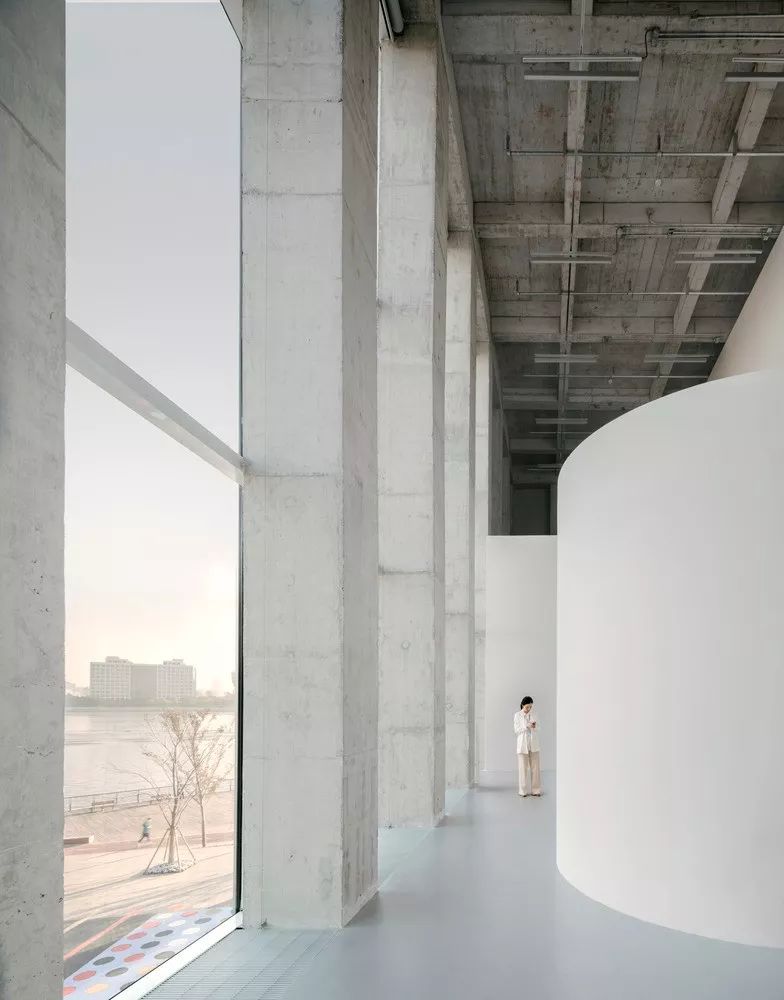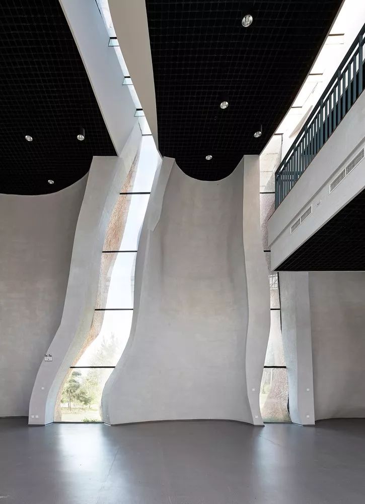 台州当代美术馆美术馆试图以现浇混凝土的粗砺与平行筒拱空间的细腻营造崭新美术感的空间氛围,筒拱的结构非常好地结合了展厅的灯光设计,并且在空间上沟通着建筑的内外,形成了结构与风景的对应。