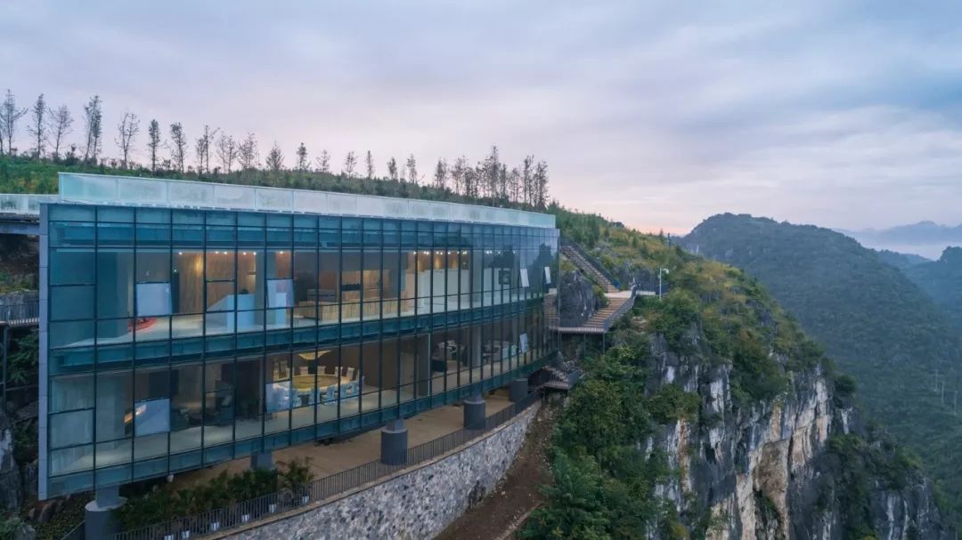 溶岩美术馆修建在海尾山谷北侧的巨大岩壁之上,可以俯视整个山谷,奇峰、怪石、河流、天坑,以及谷底的游客服务中心建筑群都尽收眼底;稍抬头,是一望无际的万峰如林。日出、日落、云卷、云舒,置身溶岩美术馆,有一种不真实的幸福感。