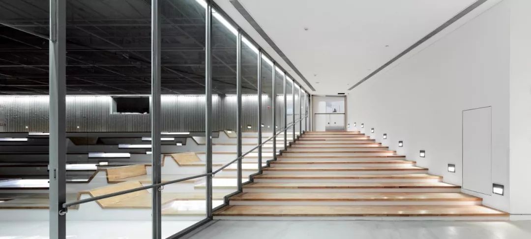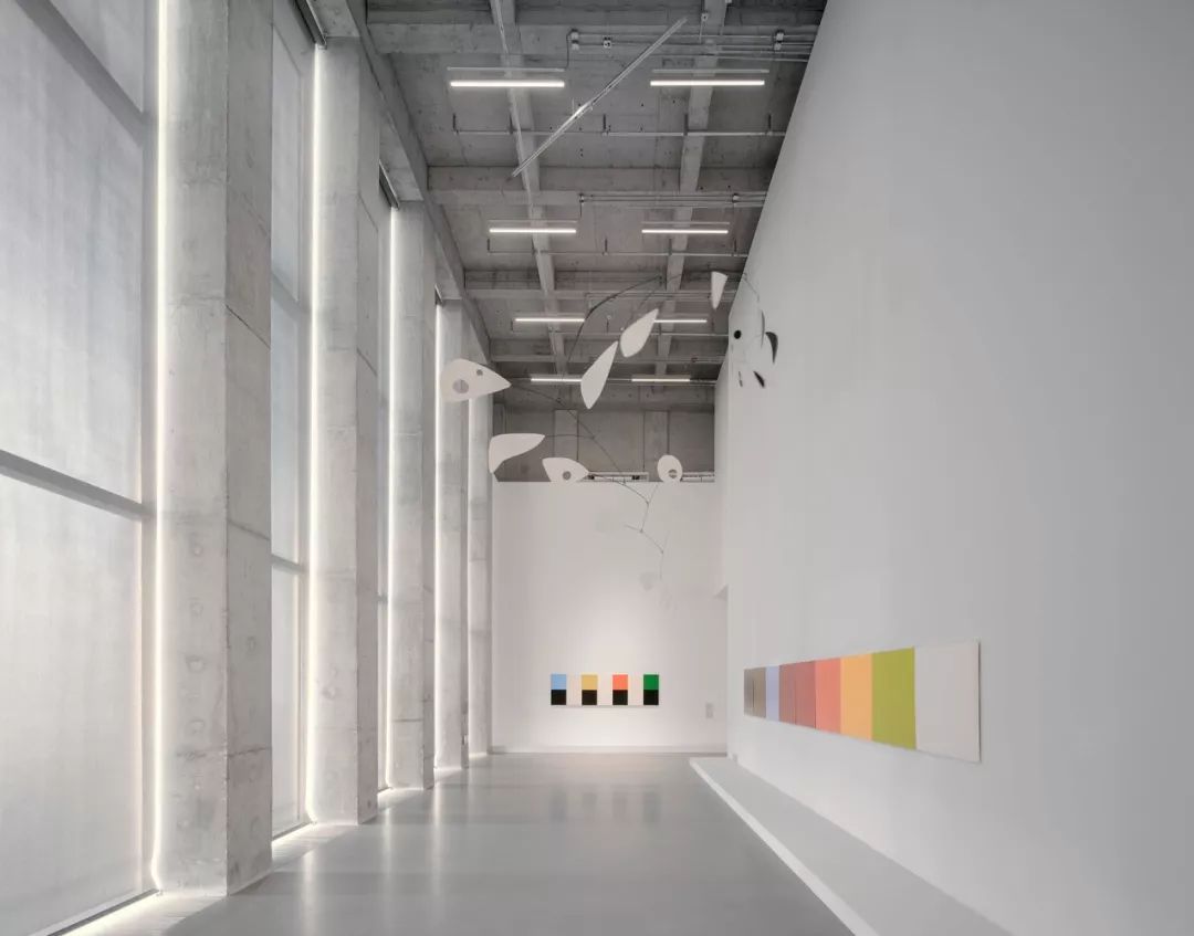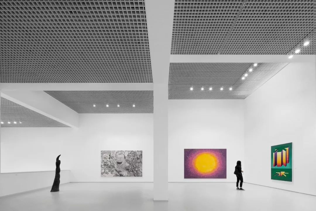 泉美术馆建在宋庄的一个湖泊旁,整个空间设计简洁大气,铝格栅吊顶给空间带来简洁一致的中性氛围,给艺术展品创造最佳的背景。屋顶阶梯式的露台相互形成高度差,自然的光线直抵每一个展览空间。
