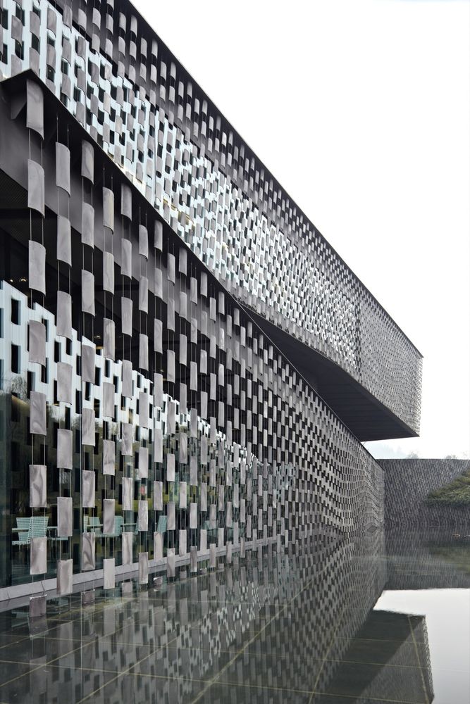 “知•美术馆”由著名建筑师隈研吾设计,位于新津县老君山山脚下,引导人们到达山顶道教的圣地,瓷砖由线缆相连,悬浮在空中的瓦片给人一种轻盈自在感,空间旋转的造型,让光线由暗延向光明,穿透瓦片缝隙的光影尤为柔和。