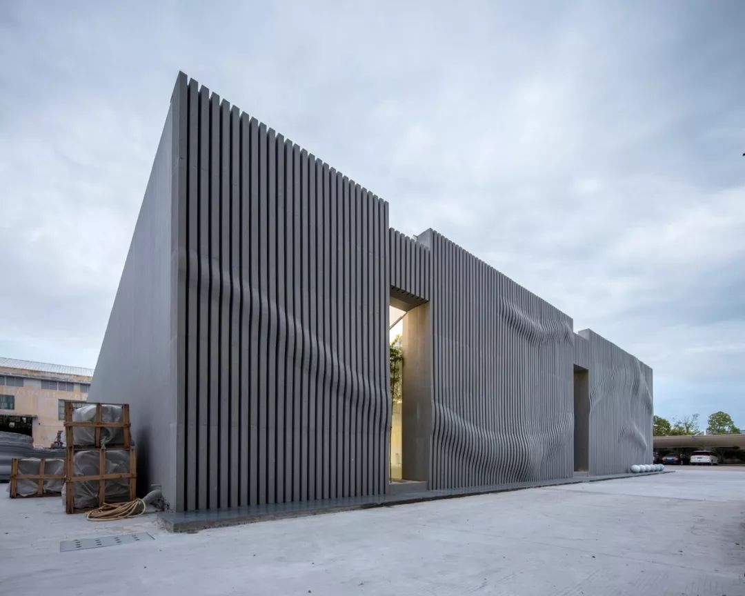 银川当代美术馆外观的设计是基于这千年间地貌的变化,以流动的皱褶肌理还原了千百年间塑造了如今地貌的沉积岩运动,同这片土地千年前的过往发生着对话。犹如一个“运动中”的地质断面,暗喻着这片土地千年间的变化,其流畅、优雅的线条,给人以轻盈的印象,仿佛是“降落”在大地上,自成大地的景观。