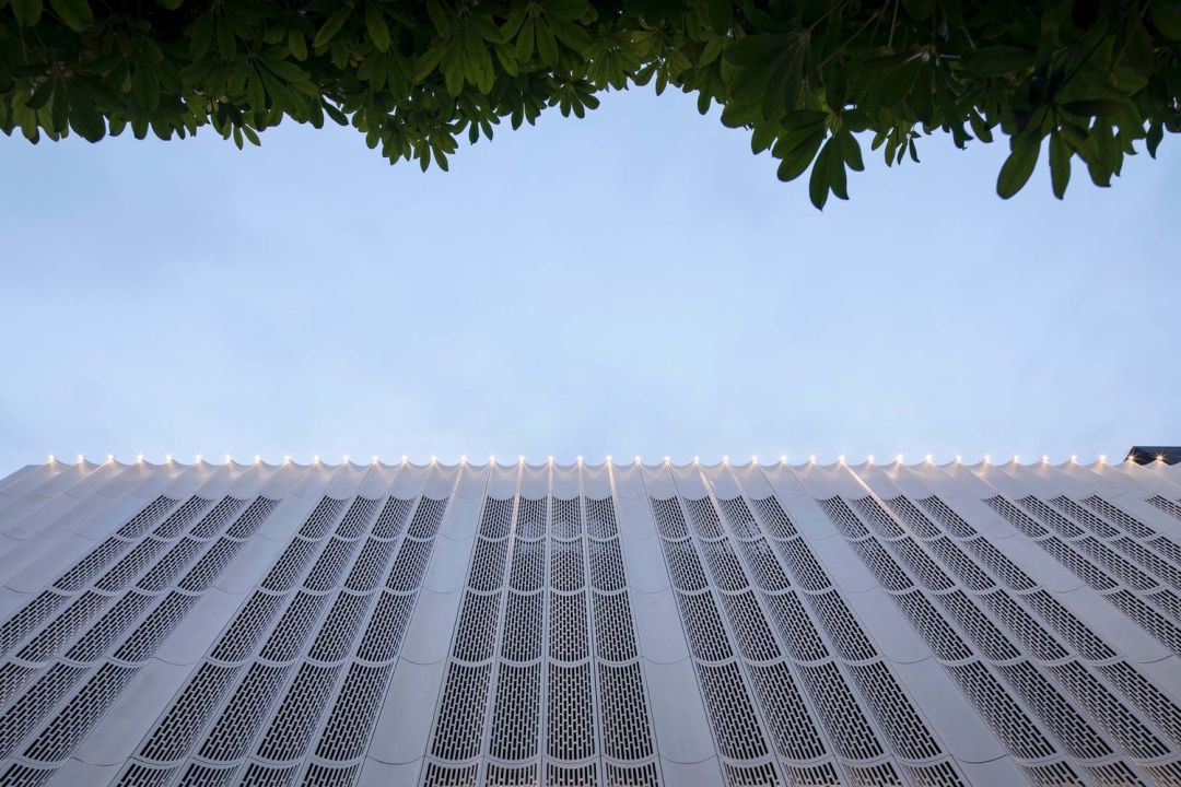 西岸美术馆地块呈三角形,位于宽阔的滨江绿化带的最北端,围绕该建筑的地面广场被抬升至洪泛区之上,黄浦江景致一览无余。立面材质将斑斓的日光带入建筑,夜间也透出绚丽的灯光,与悬挑屋顶光洁的质感涂料饰面形成鲜明对比。