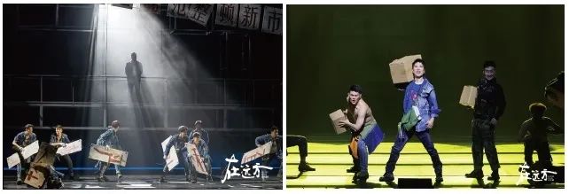 大幕拉开,巨大的钢铁货架、原木色的快递箱共同搭建出《在远方》富有粗犷美感的舞台。《在远方》故事横跨二十余年,舞台上由巨大的钢架搭建而成,一道道钢架象征着那个建设的时代,那些印着“青春”的文化衫、陈旧潮湿的地下室、霓虹灯的广告牌、醒目的标语等视觉元素,迅速把观众带入到那个方兴未艾的建设年代。