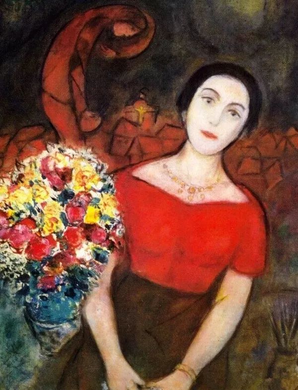 花束对夏加尔有着特殊的意义,因为他收到的第一束花,就来自贝拉。1914年7月7日,夏加尔忘记了自己的生日,贝拉却在那天大清早去市郊采花,还特意换上了美丽的长裙,再带上食物,飞奔到夏加尔的住处。闻着鲜花的芳香,夏加尔情难自抑,在生日后的几天便向贝拉求婚了。 以后每逢结婚纪念日,当贝拉用花朵或各种五彩缤纷的东西装饰两人的房间时,夏加尔都会叫她保持固定姿势,为她画像。