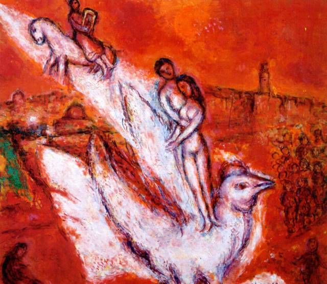 美学家蒋勋说:“夏加尔一生都在逃亡,因为1914年第一次世界大战,因为1917年俄国大革命,因为1939年第二次世界大战……但你从他的画作中很难看到逃亡、那种苦难、痛楚,他的画作总是在画美的东西,爱情啊、故乡啊之类。” 作为经历过两次世界大战的犹太人,有太多难以言传的痛苦。夏加尔的一生颠沛流离,但他却歌颂光明,也许正是因为他的生活里一直有贝拉爱的滋养。