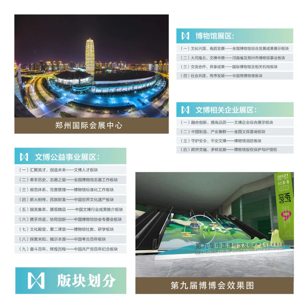 经国家文物局批准,第九届中国博物馆及相关产品与技术博览会将于2022年4月21日至24日在郑州国际会展中心举办。本届“博博会”由中国博物馆协会、中国自然科学博物馆学会、郑州市人民政府共同主办,主题为“新时代的博物馆:创新·发展·传承”。