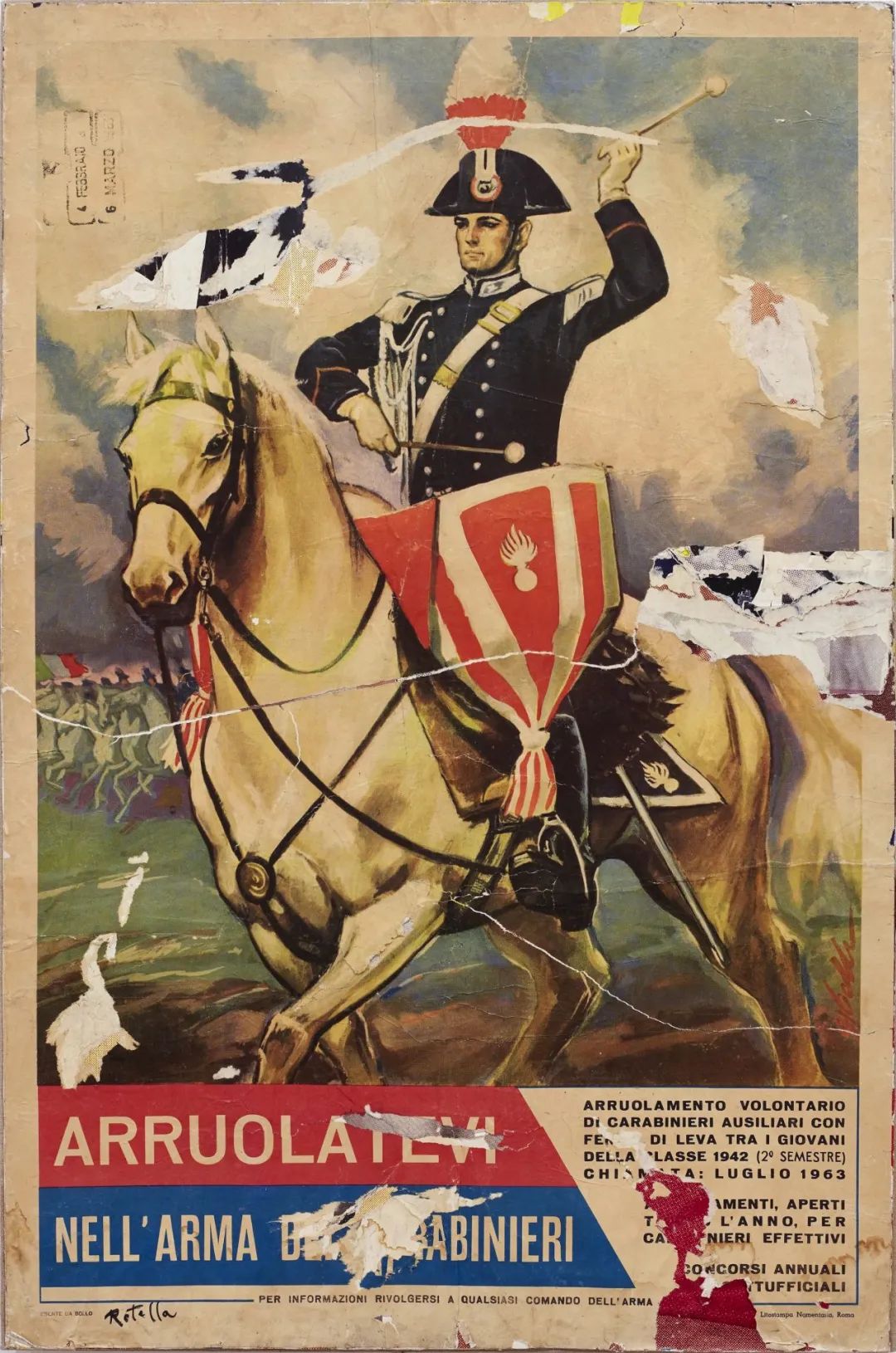 在《Carabiniere a cavallo》(1963)中,米莫·罗泰拉(Mimmo Rotella)呈现了一场自由的电影感城市景观。意大利街头海报鼓励着人们加入国家警察部队,通过撕破拼贴画而裸露出深红色、蓝色、黄色和白色的斑驳,似乎让心理上掩埋的感觉机械化了起来。在罗泰拉创作这件作品的同年,导演维托里奥·德西卡(Vittorio De Sica)通过他丰富多彩的的选集《昨日今日和明日》(Yesterday, Today and Tomorrow)将欢乐而真实的情感汇聚一堂。在高潮场景中,索菲亚·罗兰(Sophia Loren)饰演的角色随着亨利·赖特(Henry Wright)为马塞洛·马斯楚安尼(Marcelo Mastroianni)演绎的歌曲《Abat-Jour》翩翩起舞,而他则四肢蜷缩成婴儿般的姿势,显然很渴望她。赖特唱道“灯罩,当你洒下蓝光时,也许你也在寻找一个不再存在的人。”这张唱片及其迷人的手风琴演奏将罗兰的舞蹈和马斯楚安尼无拘无束的渴望,带入了与罗泰拉的梦境相似的神秘场景之中。