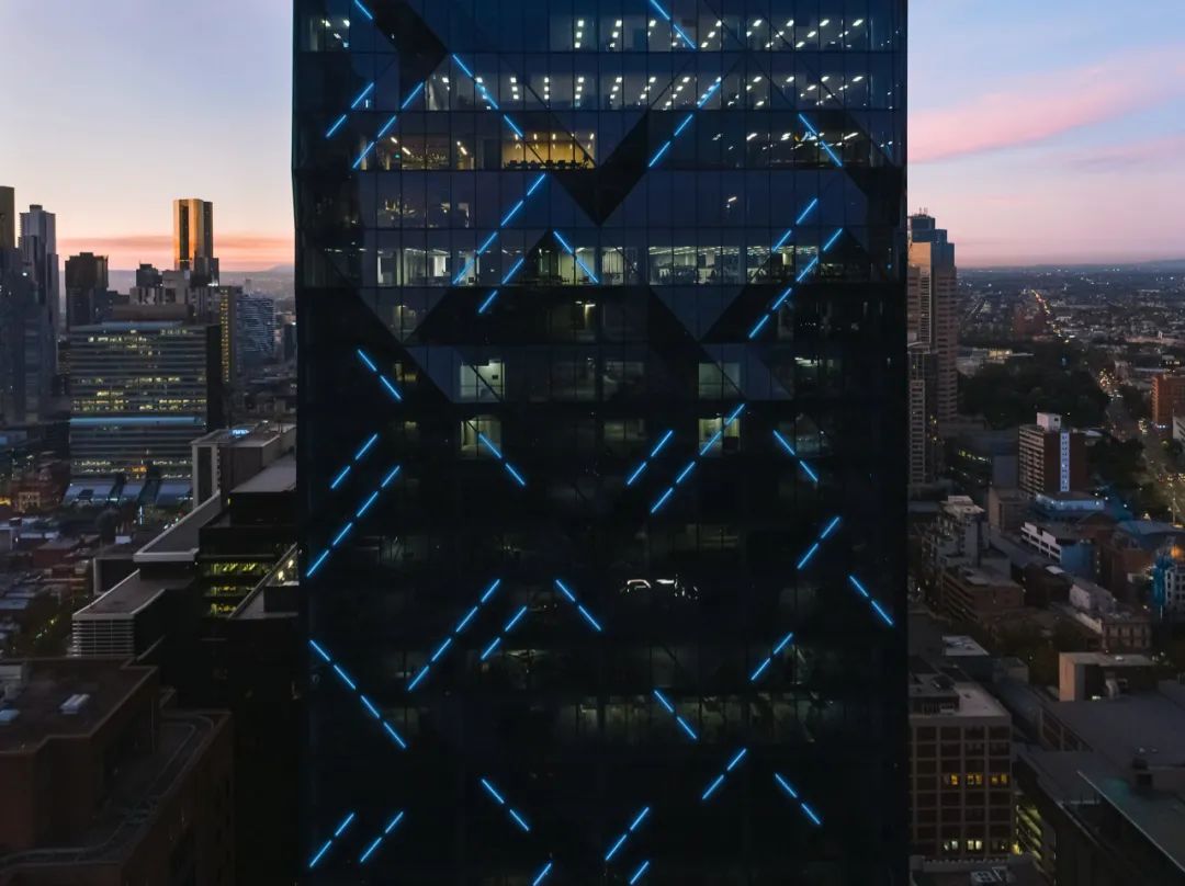 “Still Light”由 1,136m 单独映射的 LED 灯具和 RAMUS 团队的定制软件平台 CORE 组成。这个定制的控制系统操作每个灯具,并将内容整合到一个动态的自我调整时间表中,使建筑能够响应城市的不同节奏。这件艺术品会显示由 RAMUS 创意团队编程的每个单独灯具的低分辨率动画。作品拥有数小时的视觉内容以及柔和的辐射,以鼓励墨尔本CBD的缓慢节奏。玻璃和钢的结构似乎在轻轻移动,甚至偶尔会消失,因为灯光在墨尔本的天际线上故意使其形式非物质化。