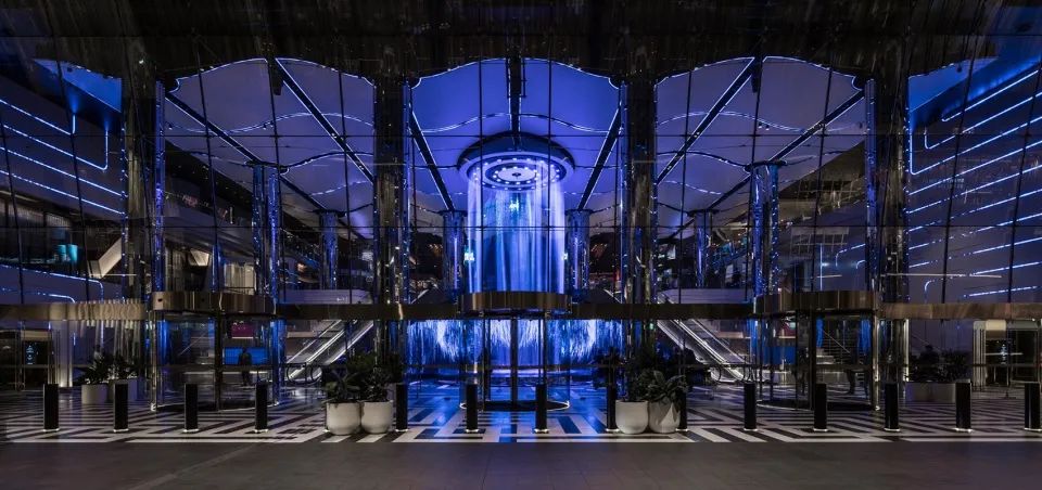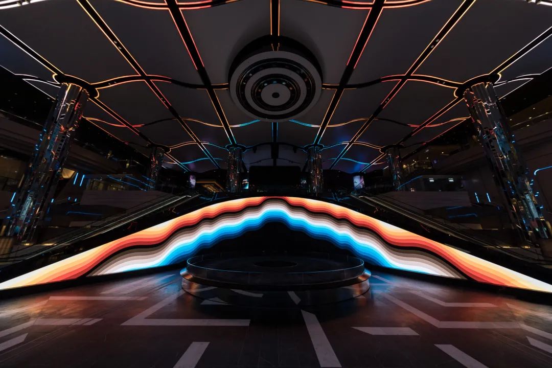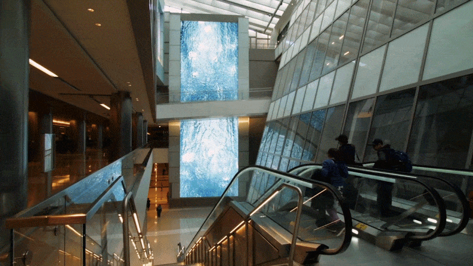 一个13米高的圆柱形、可编程的瀑布造型艺术作品以多种形式向下穿过空间的中心,为整个空间赋予一种由光线、镭射与投影带来的优雅与动感。该装置将根据一天中的时间变化,在环境、景观和互动状态之间调整其内容。