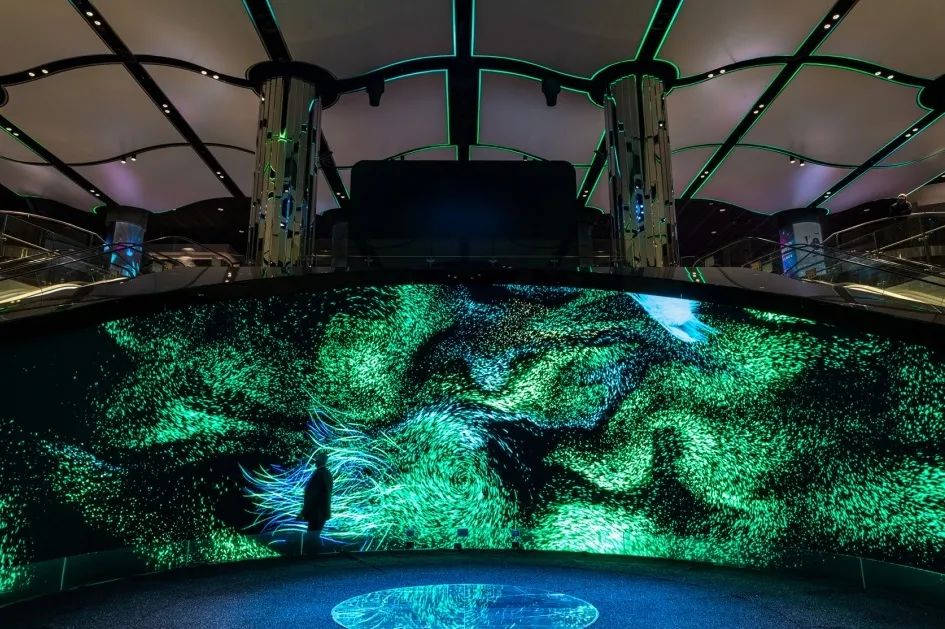 这件位于悉尼的世界首创的永久性沉浸式体验——半光、半水、半互动的艺术画廊,是一个长25米,8k分辨率的交互式数字画布,这幅画布根据人类节奏进行策划,通过本地和国际艺术家、动画师和电影摄影师的数字艺术作品表达了悉尼的光和运动。