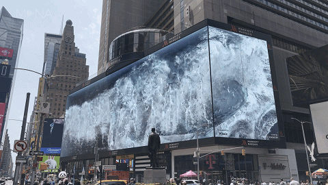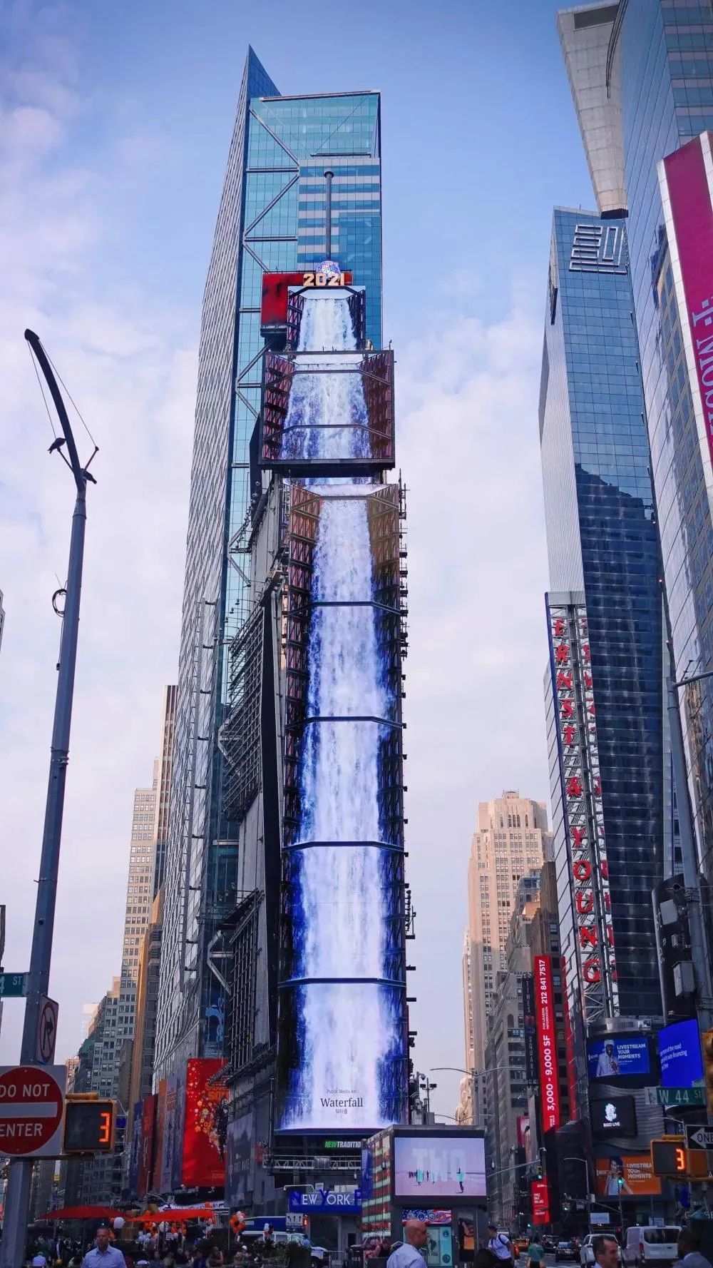 2021 年 7 月,由 d'strict 组建的合作媒体艺术家单位a'strict,在纽约市时代广场展示了一件名为“Waterfall-NYC”(瀑布-纽约)的公共媒体艺术作品。这件作品展示于纽约时代广场One Times Square外立面大屏幕上,采用四块立式LED屏,总高度102.5米的建筑外墙。在这座城市标志性的红砖建筑和钢结构建筑中,通过巨大的从顶部凌空飞下、势如破竹的瀑布,直达建筑的底端,营造出强烈且压倒性的氛围和裸眼3D艺术的视觉震撼。这件作品的展出在时代广场林立的300余块户外大屏幕中,依然是非常具有标志性的存在。