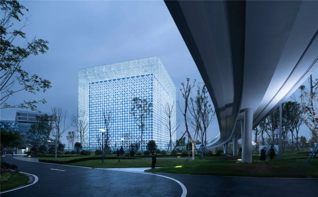 后部动力楼功能为电力与暖通机房,外立面以实墙为主,仿佛沉稳的磐石。运维楼以科研办公为主,外立面较虚,犹如镂空的宝盒,朦胧而科幻。