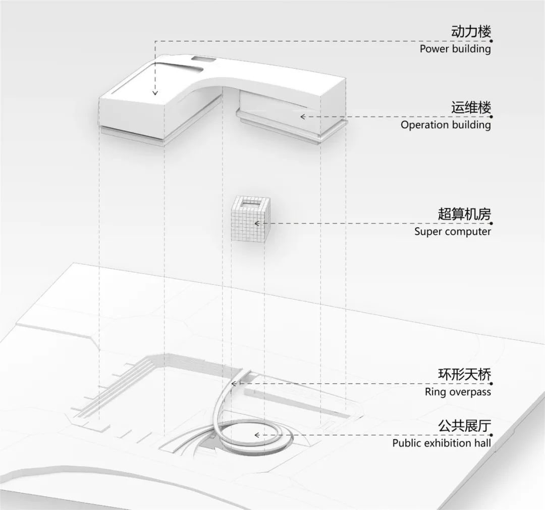 与封闭的科研园区不同,超算中心被构想为一个向城市开放的场所,一个科技的图腾纪念地。结合场地自南向北逐渐降低的地形,设计利用高差实现了开放与封闭管理的双重目标:市民通过盘旋而下的空中天桥穿越整个场地,形成参观流线,与桥下地面层的内部科研动线立体分流,互不干扰。