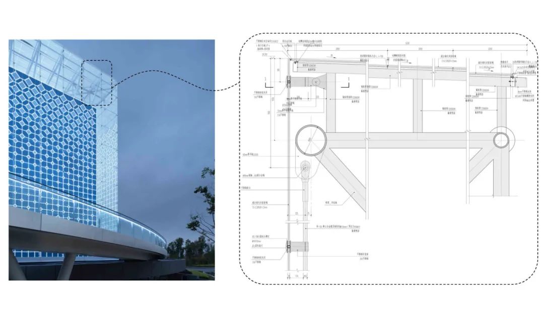 动力楼与运维楼采用双层幕墙,内层为玻璃幕墙,外层为方形的铝板幕墙。像素化的铝板单元的虚实变化,映衬出计算机语言中的“0”与“1”的关系。
