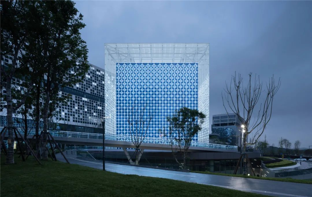 光是信息的媒介,结合幕墙单元设计的灯光秀系统,与电脑编程联动,可在夜间上演精彩的光影表演。“硅立方”成为巨大的显影屏幕,宛如湖畔神秘璀璨的“科技之眼”,成为科学城最亮眼的地标。