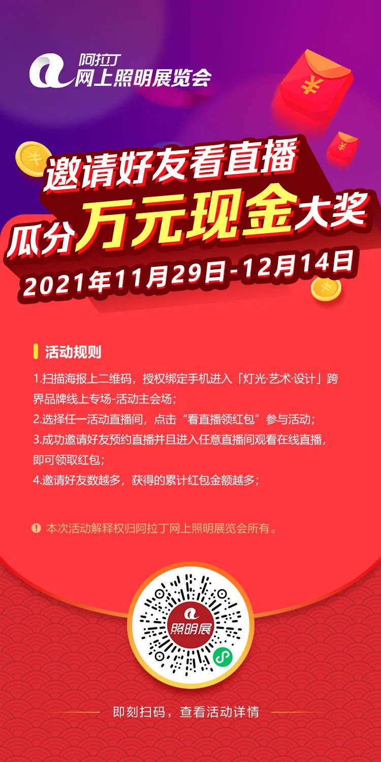 邀请生产企业、工程公司同步在阿拉丁网上照明展览会参展,打造「灯光·艺术·设计跨界品牌」线上展示专区,展示照明行业创新成果,呈现行业内优质照明产品及智能解决方案。