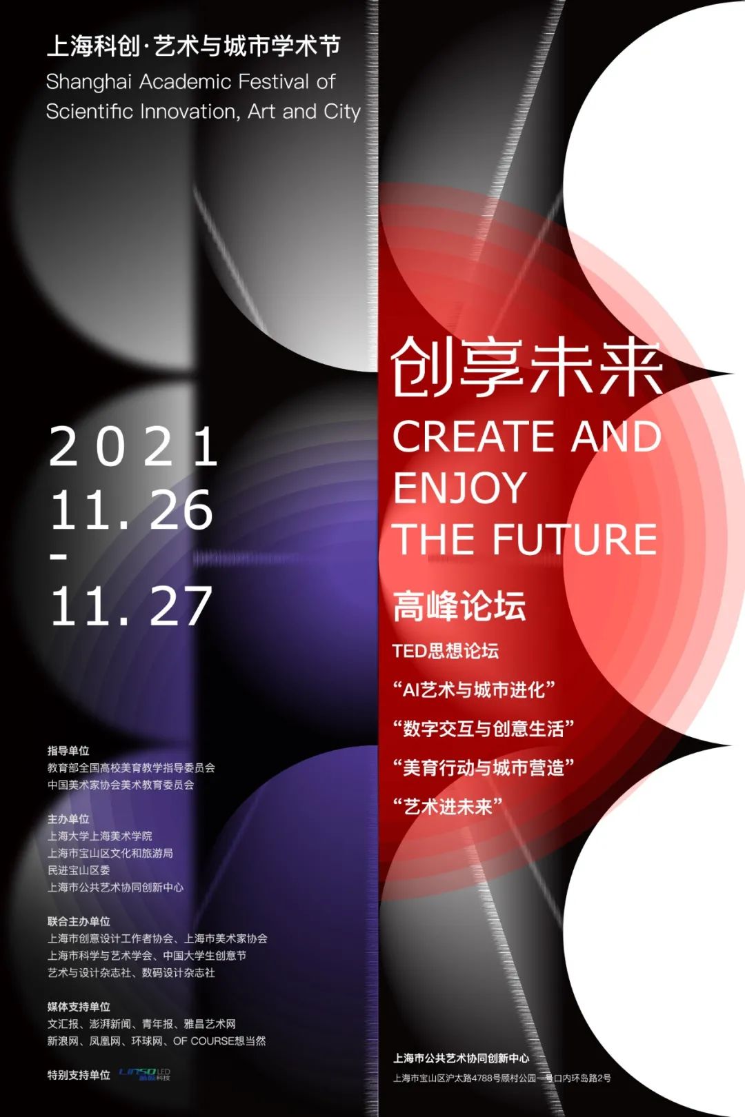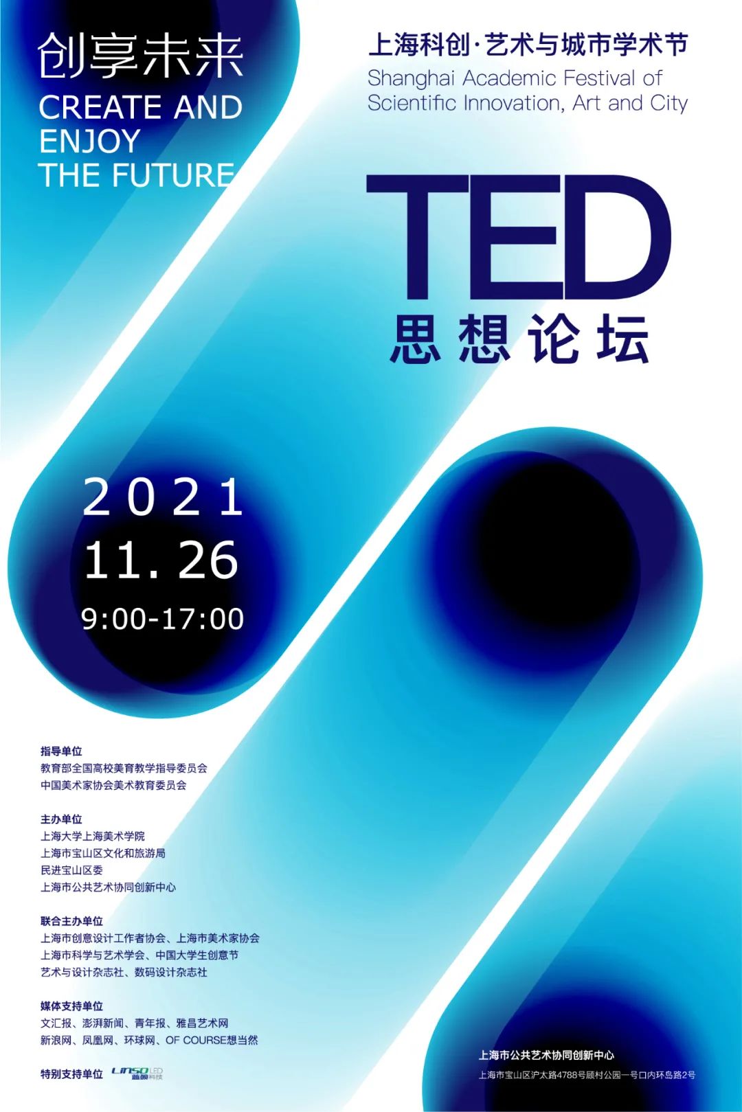 学术节以“创享未来”为主题,举办“2021创享未来——上海科创·艺术与城市”TED思想论坛与“AI艺术与城市进化”、“数字交互与创意生活”、“美育行动与城市营造”、“艺术走进未来”五大板块论坛,围绕科技、文化、艺术、融合发展的现状和趋势,促进城市转型升级、建立城市发展新格局、塑造城市科学发展观、提升城市软实力、推动青年创意人才培养等方面的论题展开讨论。旨在为各专家学者与行业精英打造一个“科创与艺术·城市”更新领域最具价值的思想平台,让前沿思想和观点得到碰撞,为上海科创中心主阵地建设建良言、献良策。