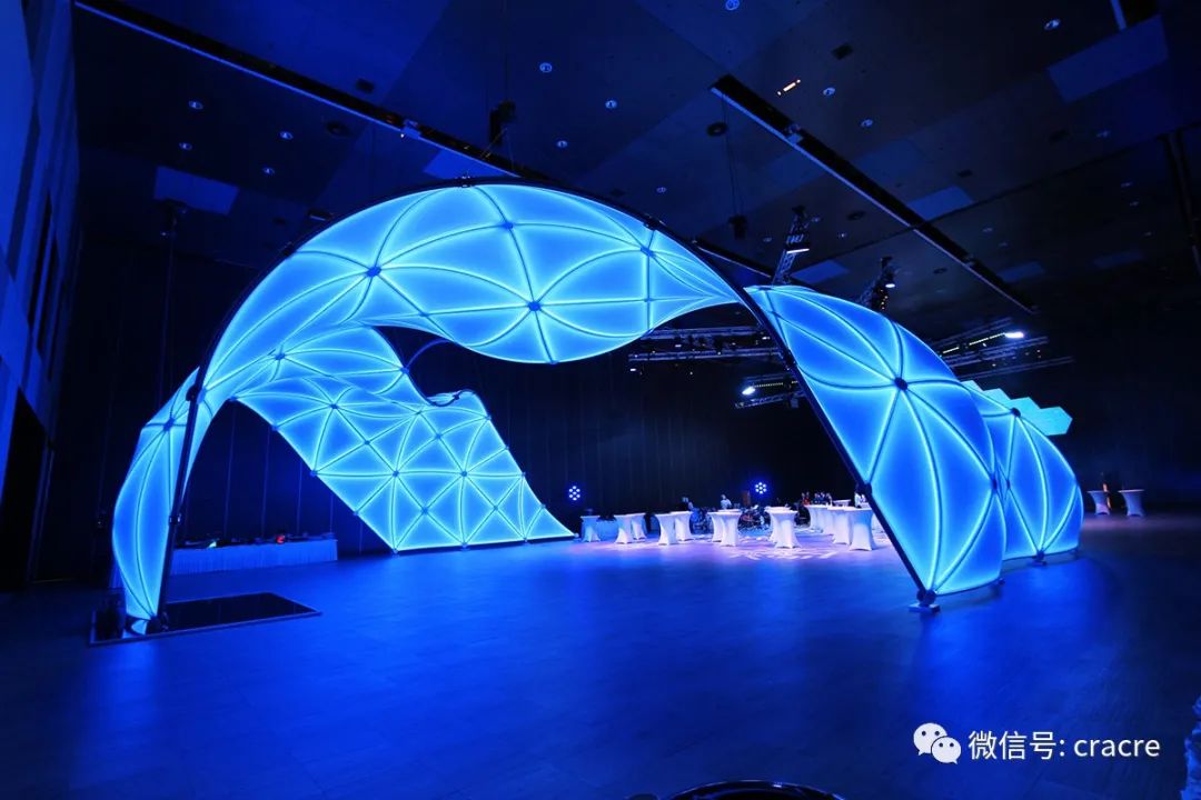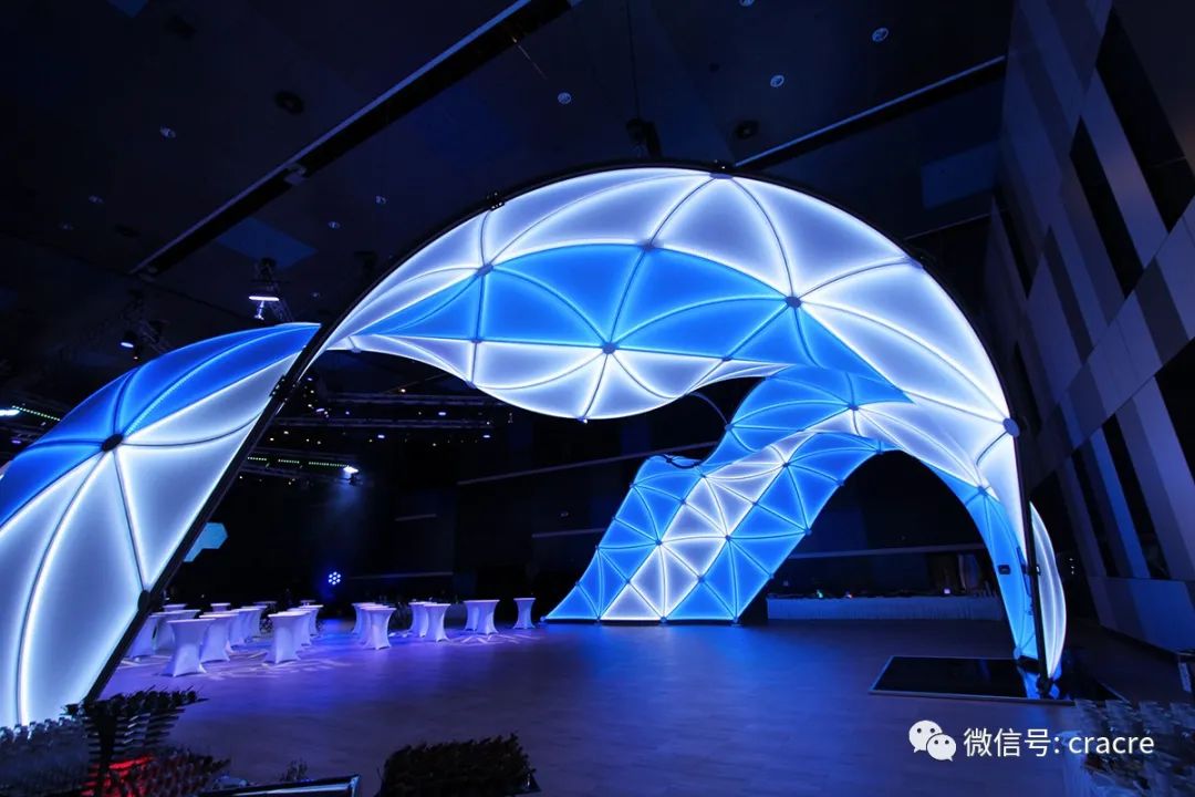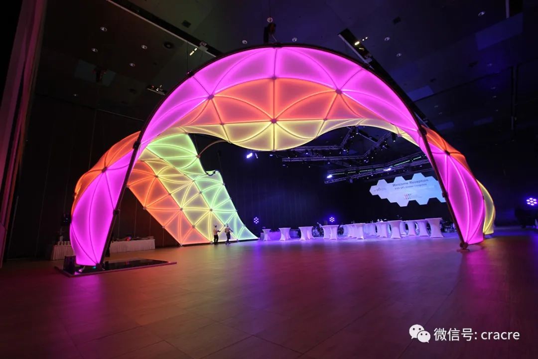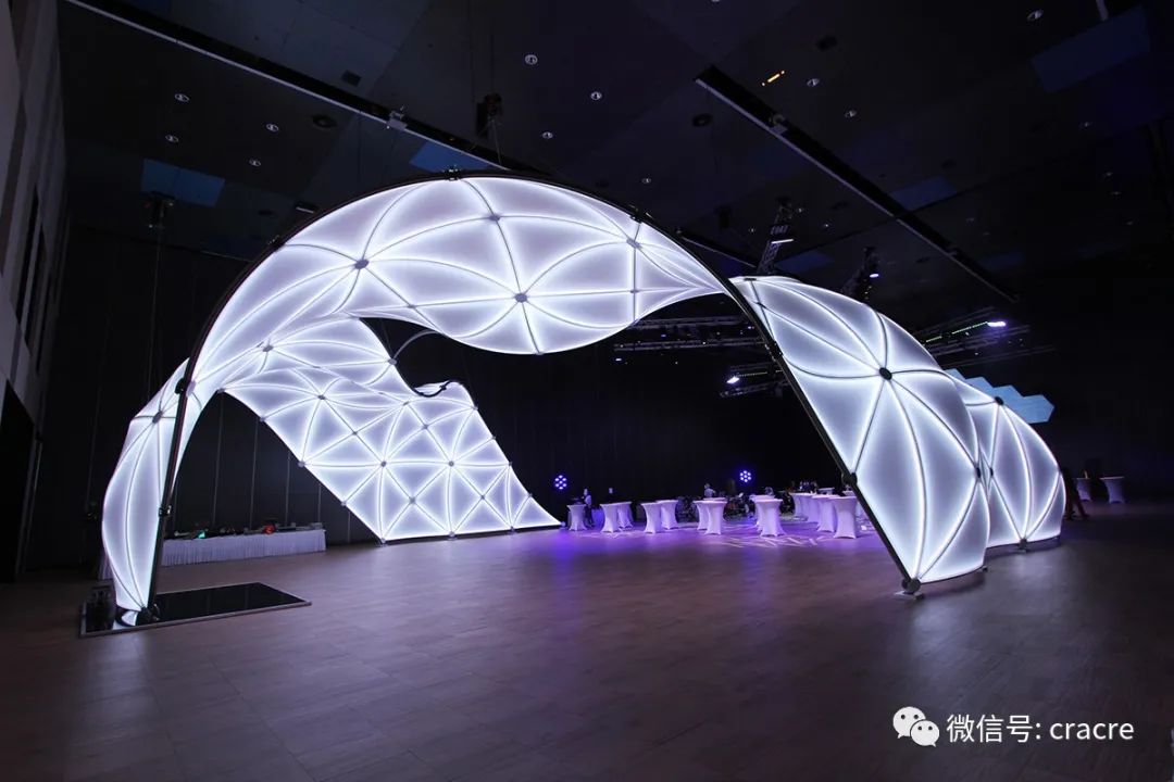 根据场地需要,可以组成各种异型架构。整体由合金模块,灯光系统及特制织物构成,配合环境需要整体变换各种灯光色彩。