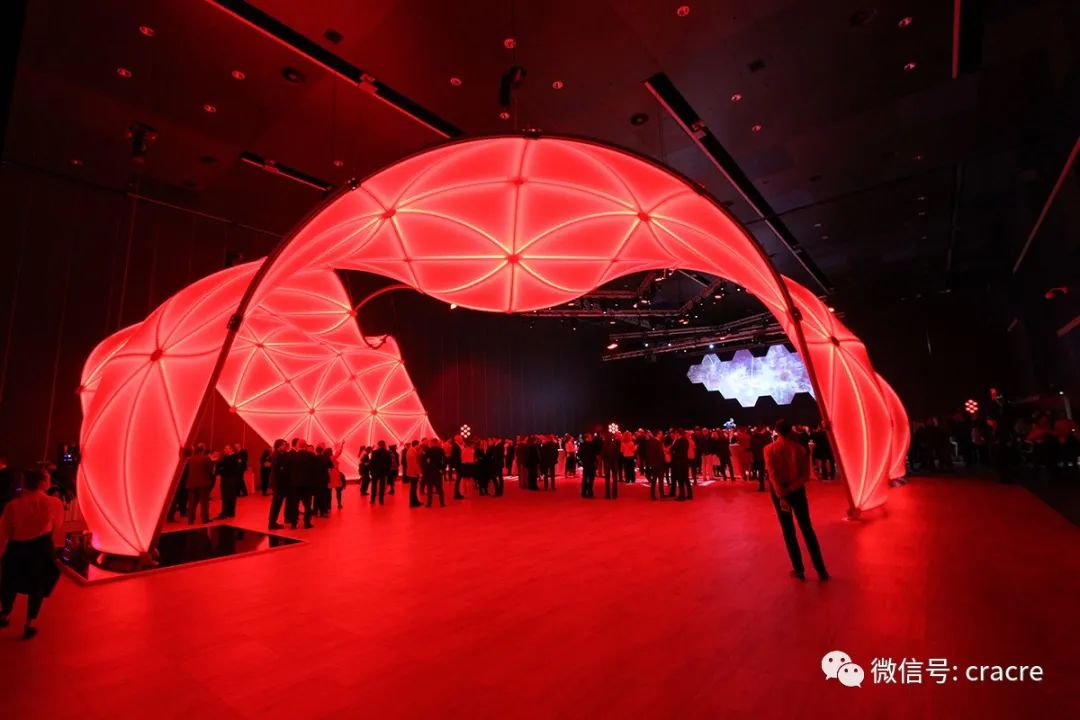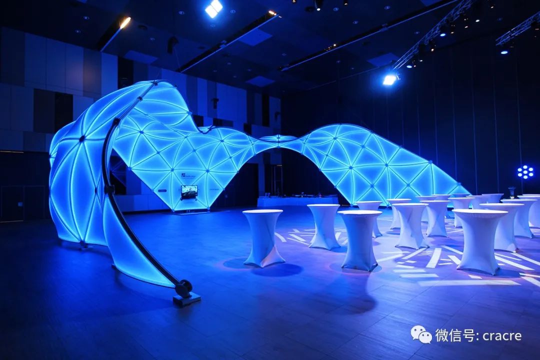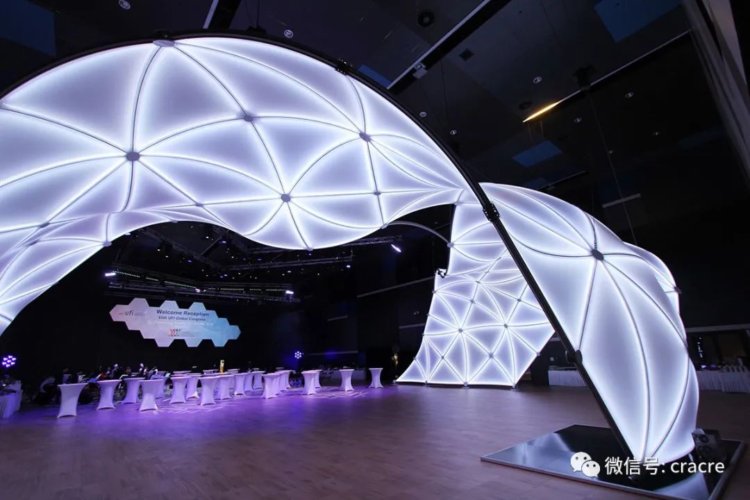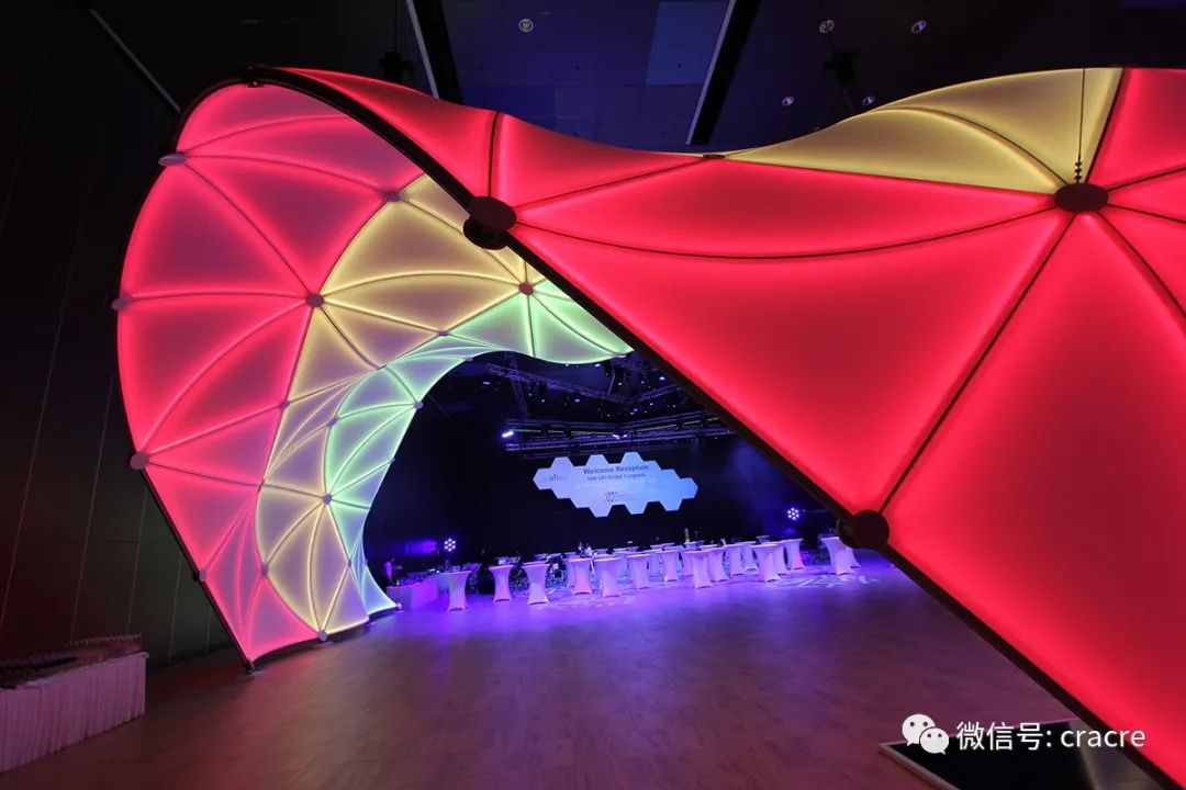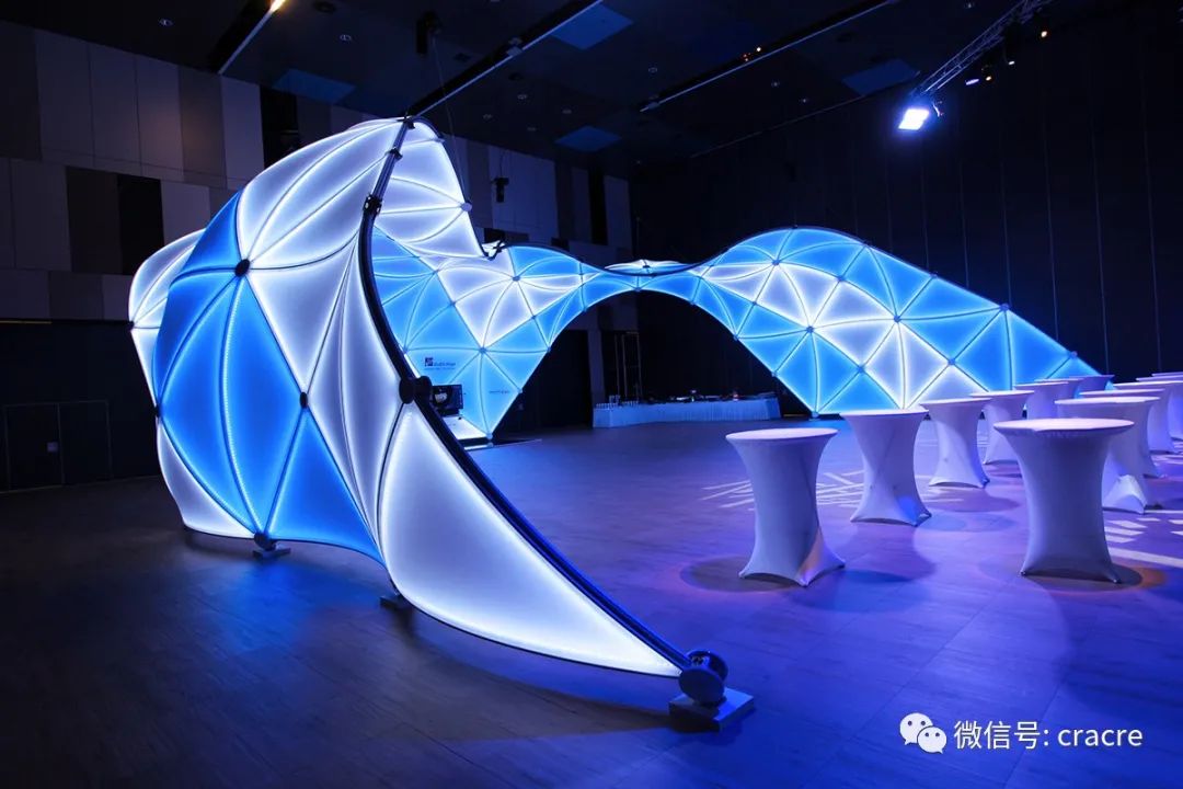 根据场地需要,可以组成各种异型架构。整体由合金模块,灯光系统及特制织物构成,配合环境需要整体变换各种灯光色彩。