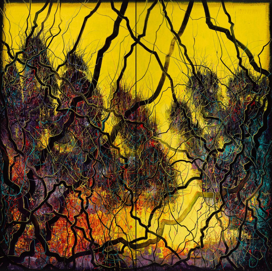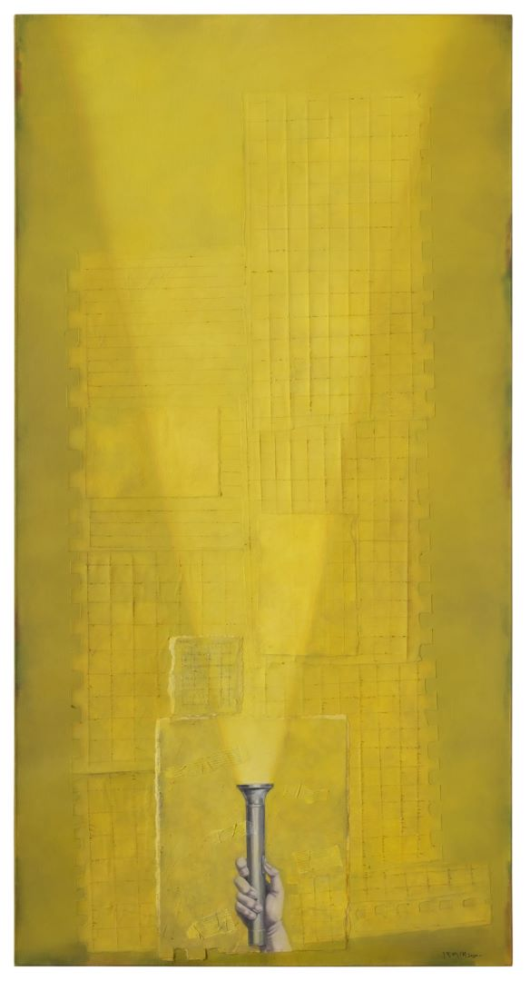 而艺术家张晓刚的画面,总透着一股沉静、深思的气质,还有些说不清的无奈与忧伤。这次成都双年展上的两件油画作品,依然贯穿有“时间”这个张晓刚艺术的核心主题。可以想象,大多数人在看到《2020年三月的某一天》这件作品的名字时,都很容易第一时间想到如今仍在对我们生活造成影响的这场疫情。这也确实是艺术家想要表达的感触。而在隔离期间,张晓刚第一次尝试用极慢的速度去完成一幅画作。那手电筒射出的柔和光锥,朝着天空的方向,也指着未来的希望。