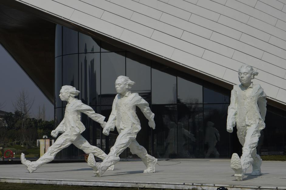 中央美术学院副院长、艺术家苏新平则带来了他最新的大型雕塑创作——对!就是场馆口那三个人!它沿袭了艺术家90年代以来社会关照的现实角度,这个奔走的形象出自2010年的油画《奔波的人》。艺术家以自身为原型,用仪式化的形式语言在现实逻辑里抽象出这个关于“行走”的肢体动作和面部表情,凝结出某种具有稳定意义的视觉符号。
