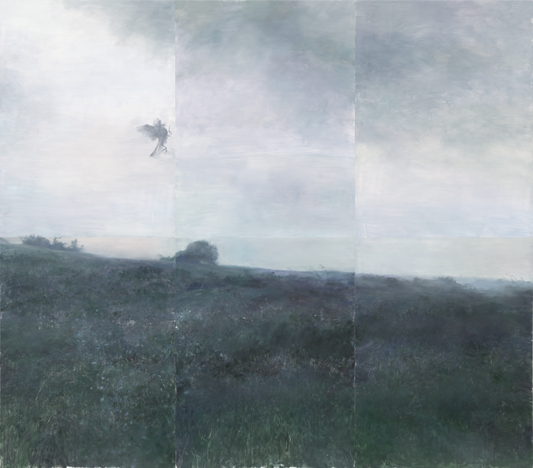 谈及中国现当代绘画,何多苓是个无法绕开的名字。自上世纪80年代起,他就被视为国内最具水准且最为独特的写实主义画家之一。当与之同时代的艺术家纷纷涌向反刍沉重“伤痕”的宏大浪潮时,他始终坚持诗化的图像语言,欣然独享前往虚空诗境的孑然飞行。在展厅另一侧,何多苓为本次展览带来了巨大尺幅作品——《鸟飞绝》。这件作品由6幅大画拼接而成,画面被分成两部分,下面是大片的草坡,上面是灰白的天空,一只鸟孤独的飞过,整个画面透出诗歌里特有的忧郁气质。