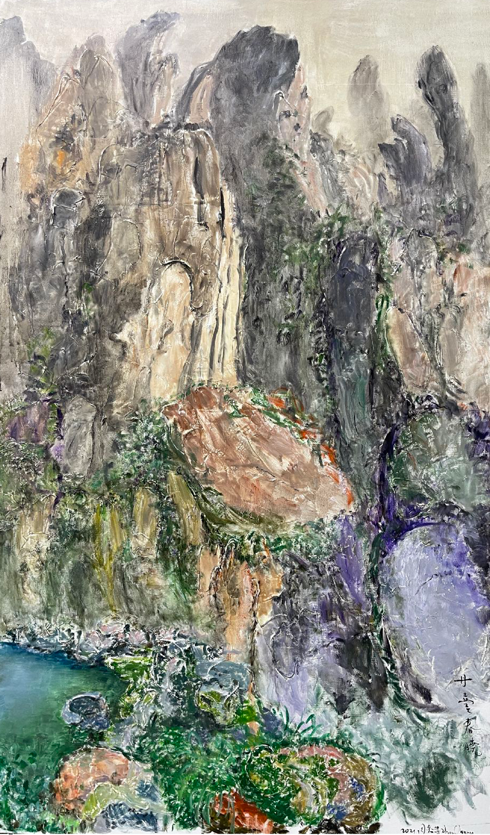 ▲ 张晓刚,2020年三月某一天,布面油画、拼贴,200×105cm,2020今年春天,艺术家周春芽和朋友们一同游览江西三清山。他发现三清山的山形很像黄山,但比黄山小巧秀丽,岩壑更显奇峻,景点也比黄山集中,移步换景、放眼如画。艺术家和一同旅行的朋友们分享各自思想和感受之余,也很想要送他们些什么,但这林泉青山里只有清淡缥缈的白云。南朝陶弘景认为这山中白云“只可自怡悦,不堪持赠君。” 于是他想:送给他们这满谷云朵、满心欢喜,也是深深的情谊。而这次展出的几件作品就是在这样的背景下创作出来的。