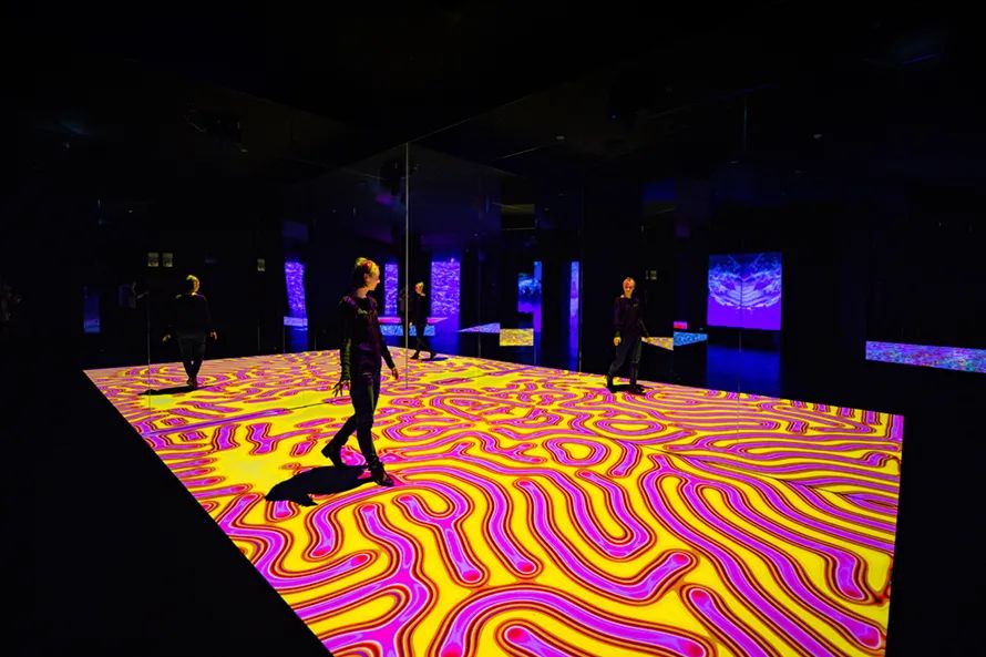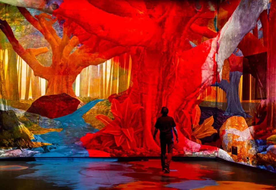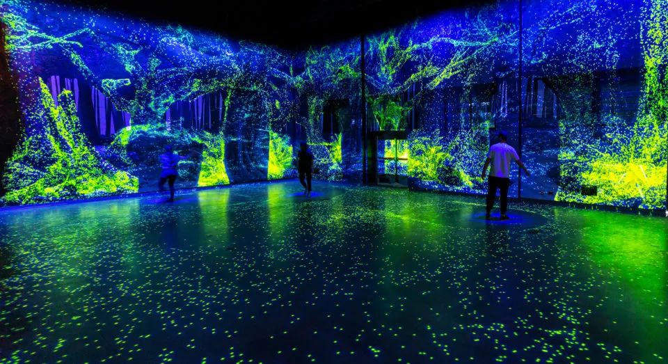 游客可以在四个场景的过程中发挥影响和进行探索,映射到地板和周围墙壁上的投影将新墨西哥艺术家 Nate Gutierrez 创作的黑白森林壁画变成了一个蓬勃发展的互动生态系统。当客人第一次接近时,就好像真菌发芽并释放出可以与之互动的孢子,然后形成由像素和故障组成的反应性数字森林。霓虹灯将客人吸引到下一个场景中,就像超现实主义植物园中的人物一样,随着森林逐渐充满色彩,最后一幕吸引游客在房间内挥洒数字笔触,其几乎就像真人大小的数字颜料。
